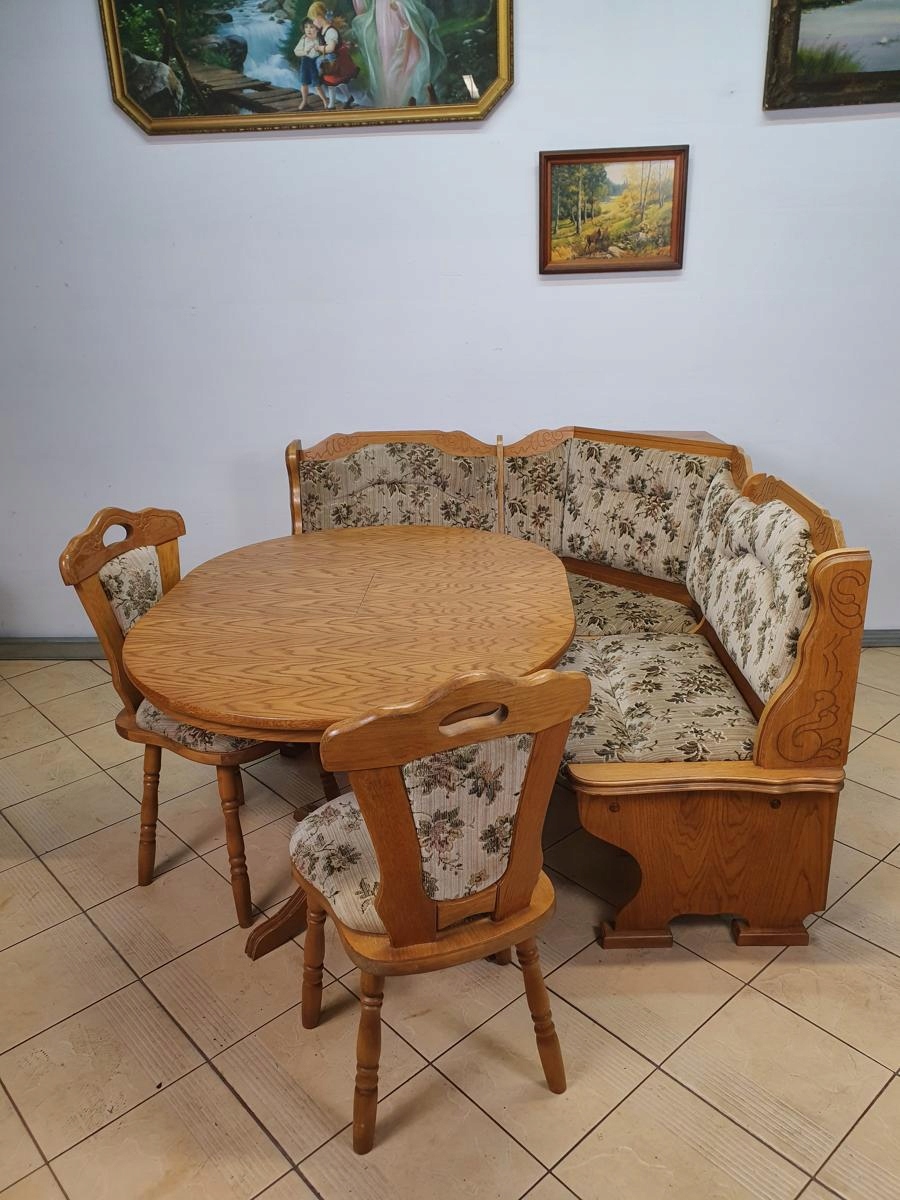 Объект аукциона - это кухонный набор, состоящий из удобного угла, сплошного стола и подходящих стульев. они были сделаны из дуба и дубового шпона. Структура очень стабильная и прочная.