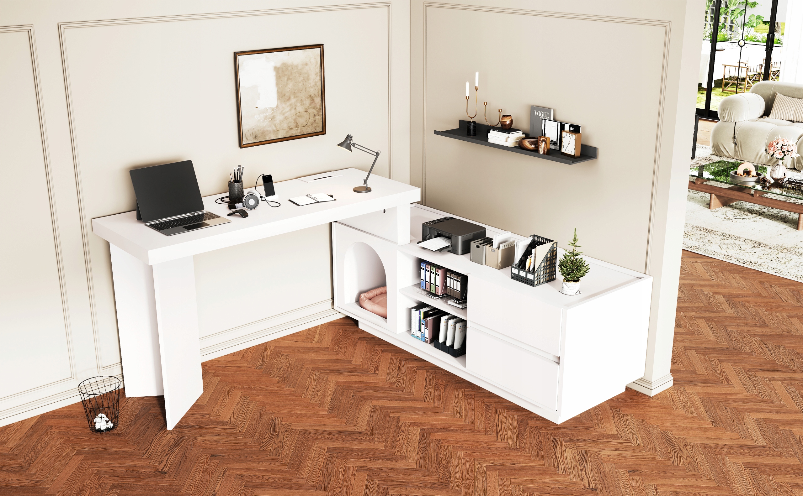 Угловой стол со встроенным домиком для домашних животных - 120 х 50 см, МДФ, толстая плита, Г-образная или цельная, гибкая сборка, угловой стол для домашнего офиса с лежачком для питомца XL, Г-образный угловой стол