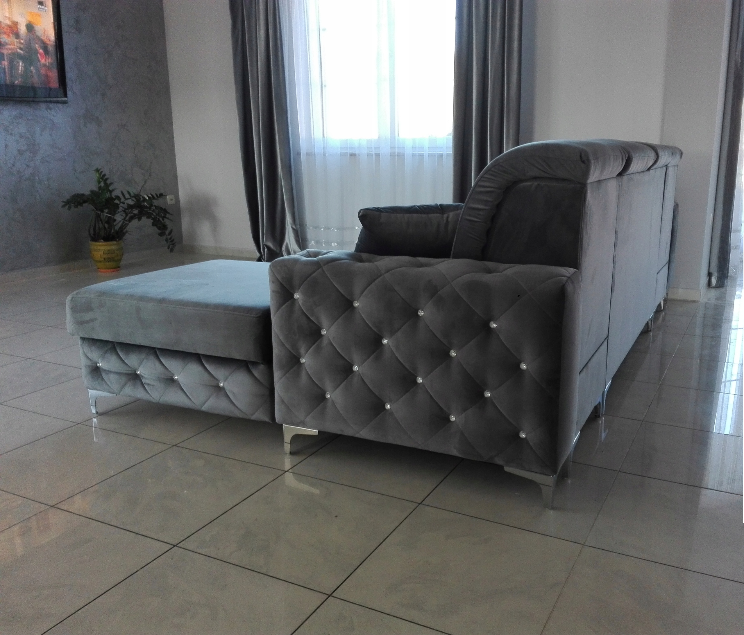 Этот продукт — идеальный способ придать вашему дому эстетичный и роскошный ГЛАМУРНЫЙ стиль! Помимо практичной спальной функции, мебель имеет ДВА контейнера для постельного белья и механизм для легкого раскладывания. Угловой диван стоит на стильных хромированных ножках, которые являются прекрасным дополнением к мебели.