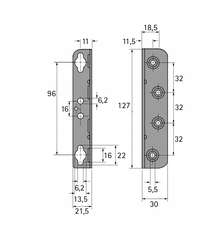 - отверстия для винтов в системе 32 мм