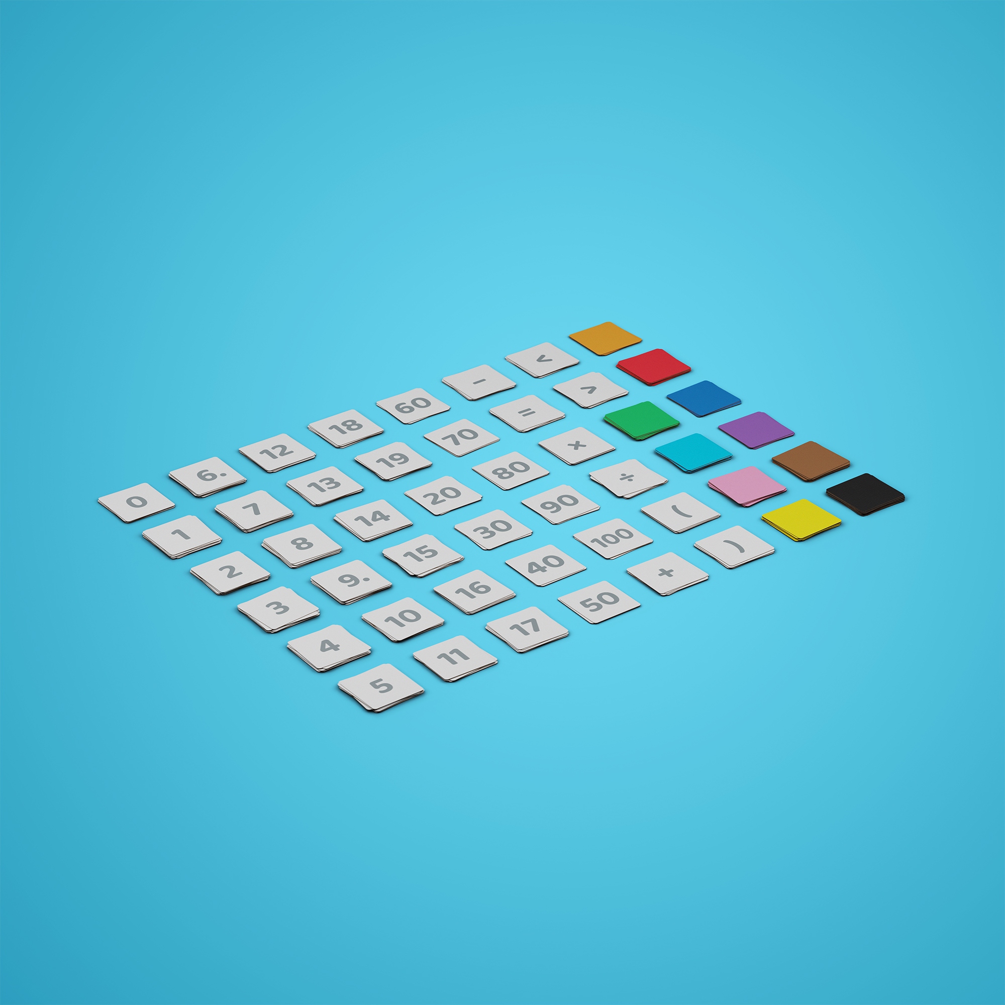 - В наборе 144 квадрата с числами, цифрами и знаками математических операций.
