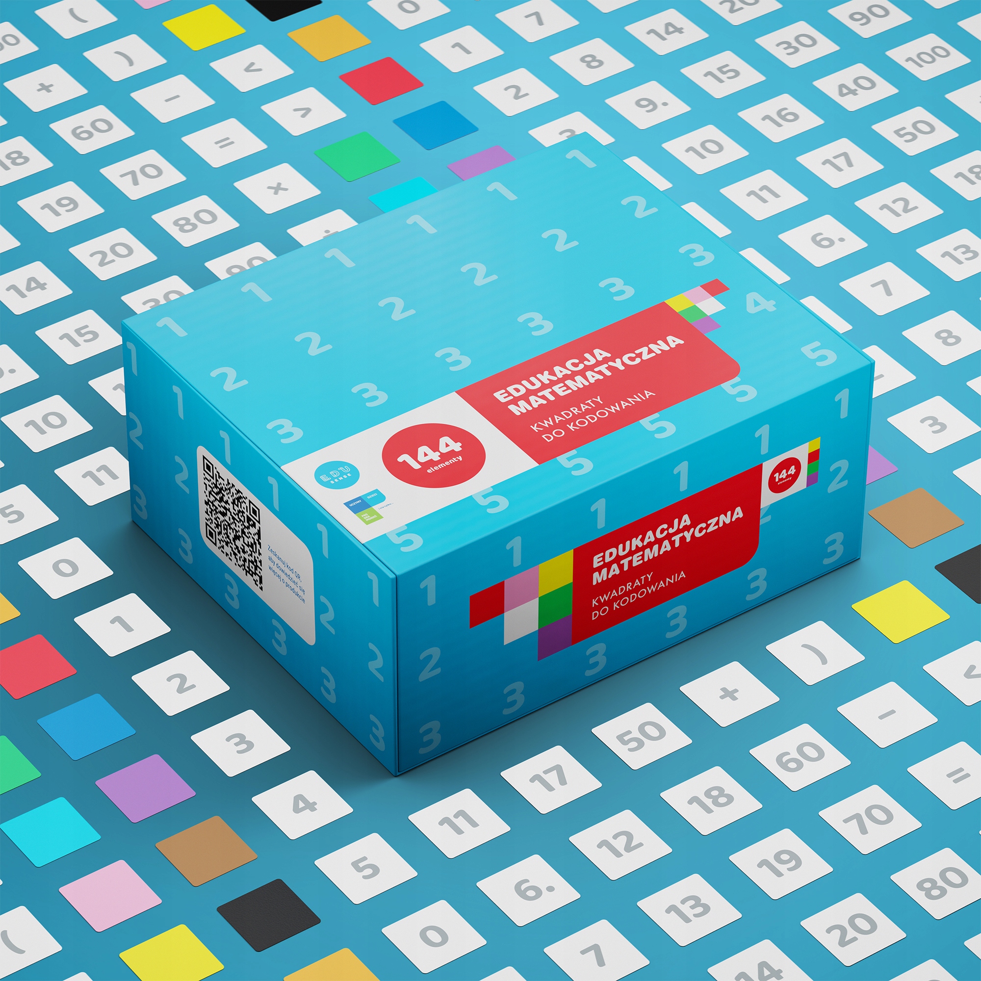 Набор из 144 квадратов с цифрами, числами и знаками математических операций (+, –, ×, ÷, =, (), < >) позволяет выполнять исчисление и логические задачи на пространстве кодирующего коврика.