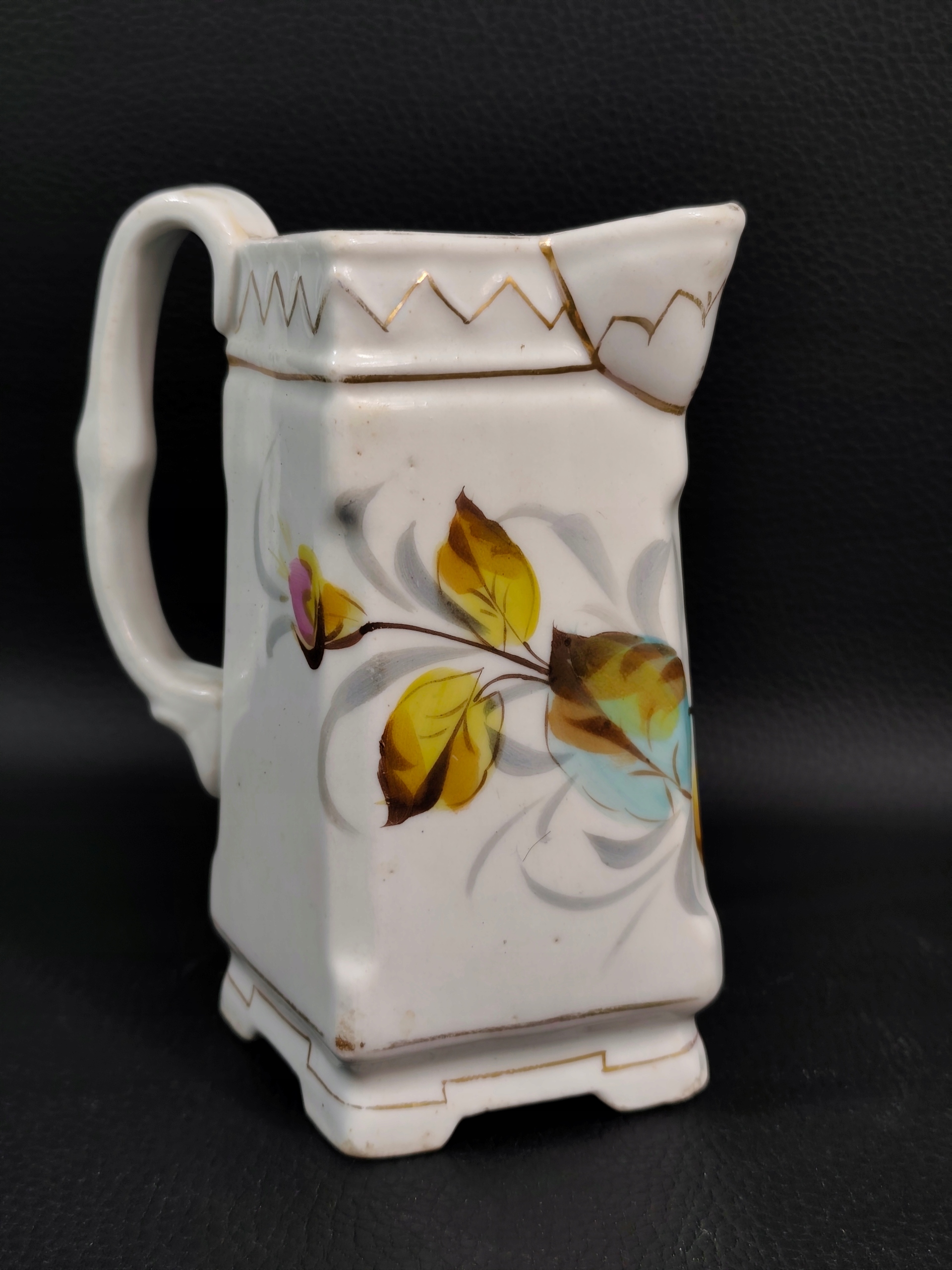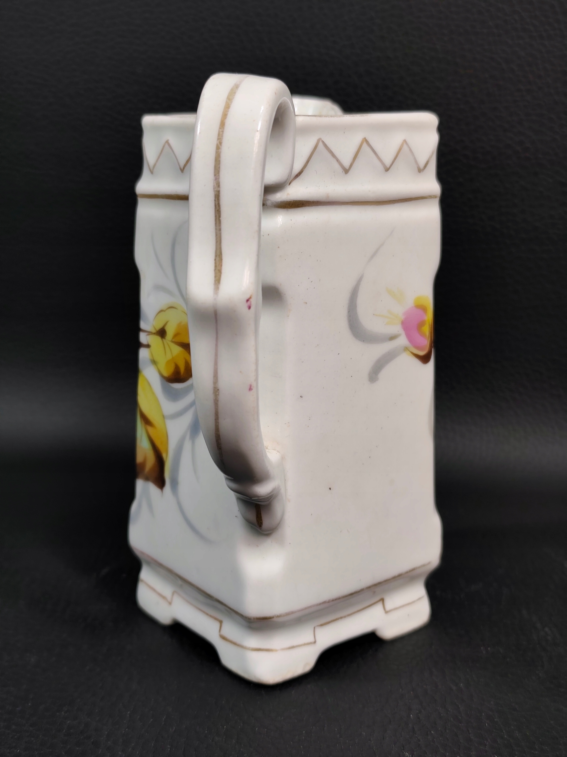 Квадратный фарфоровый кувшин в винтажном стиле, расписанный вручную, с цветочным мотивом в желтом, коричневом и синем цветах и золотым декором.