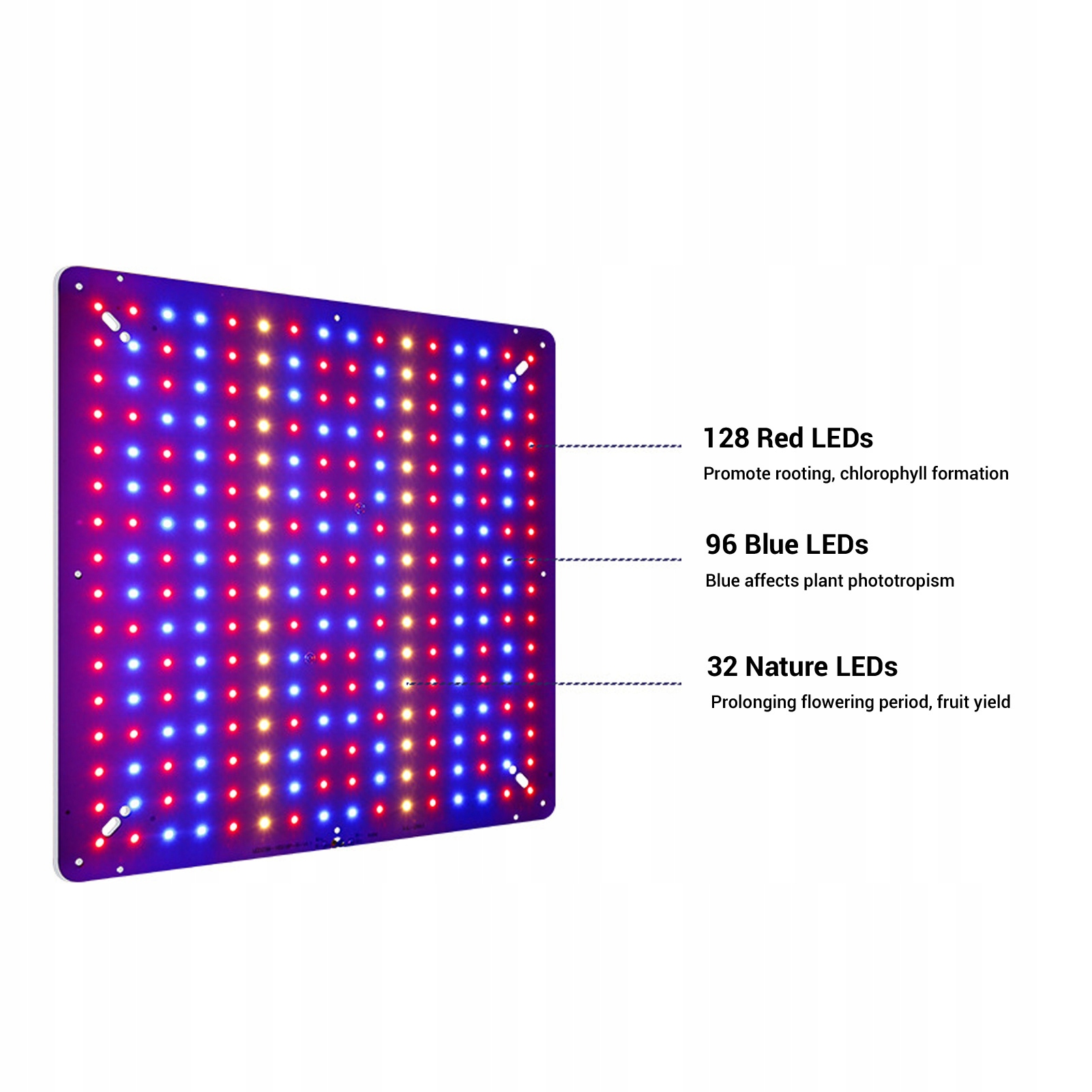 2. 256 кусочков светодиодов: обеспечить 128 красных светодиодов, 0,5 в 620 нм, способствуя размножению плодов растений; 96 синих светодиодов, 0,5 в 465 нм, поддерживает увеличение массы шансов и листьев; 32 природные светодиоды с мощностью 0,5 Вт 4000K ускоряют рост растений