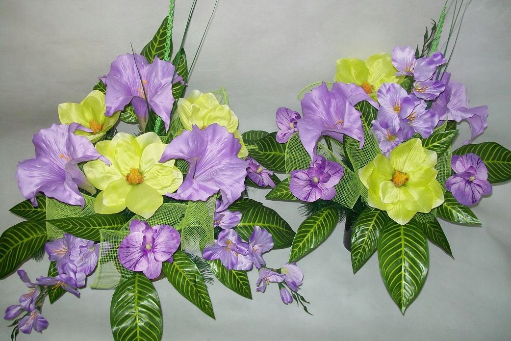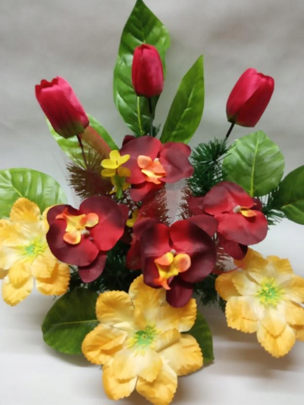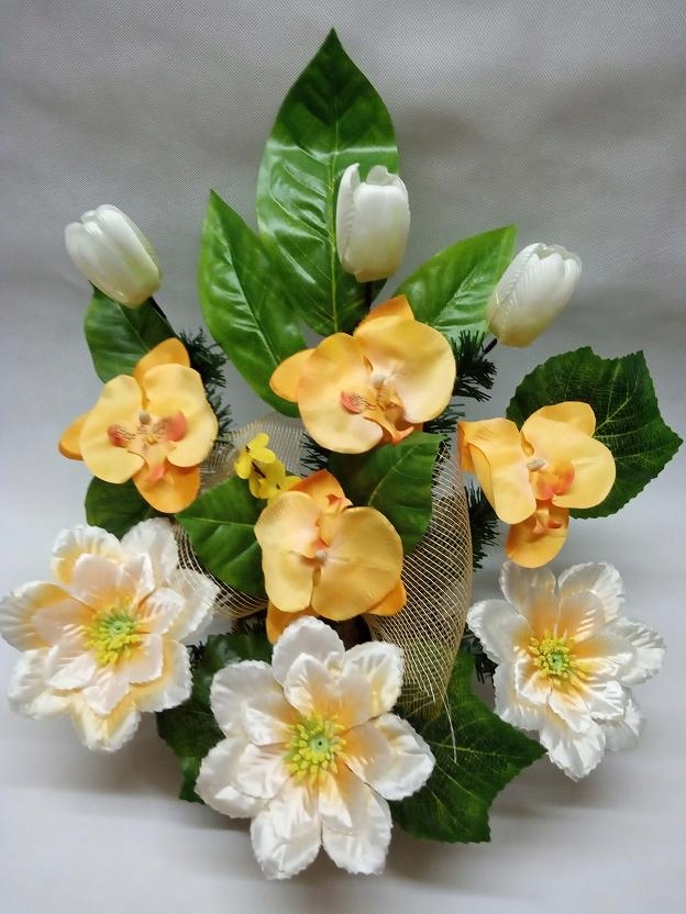 композиция для могилы (так называемый головной убор, икебана) производится на искусственном чоне, который закрыт в круглом горшке круглого пластика с диаметром 12 см на 16 см от выше и высотой 7 см.