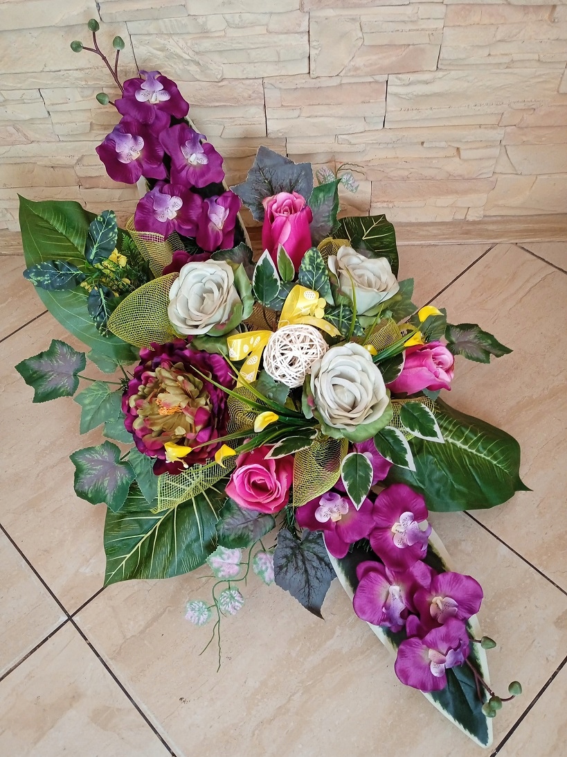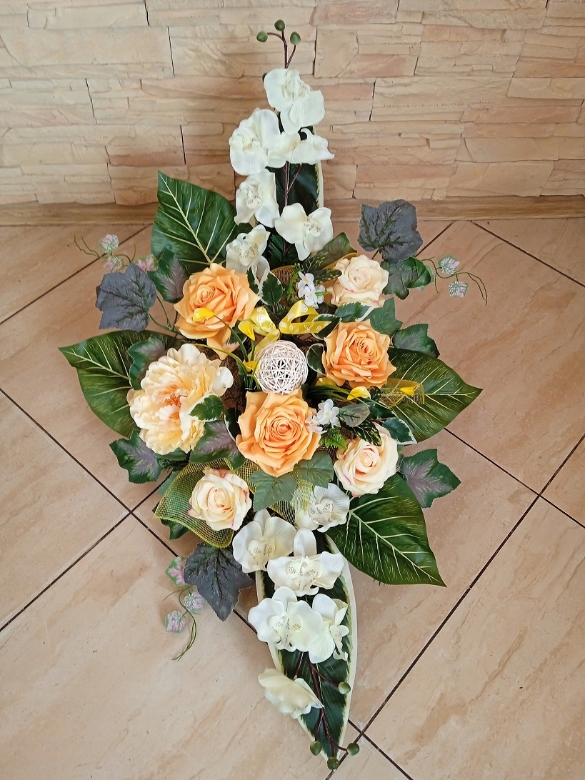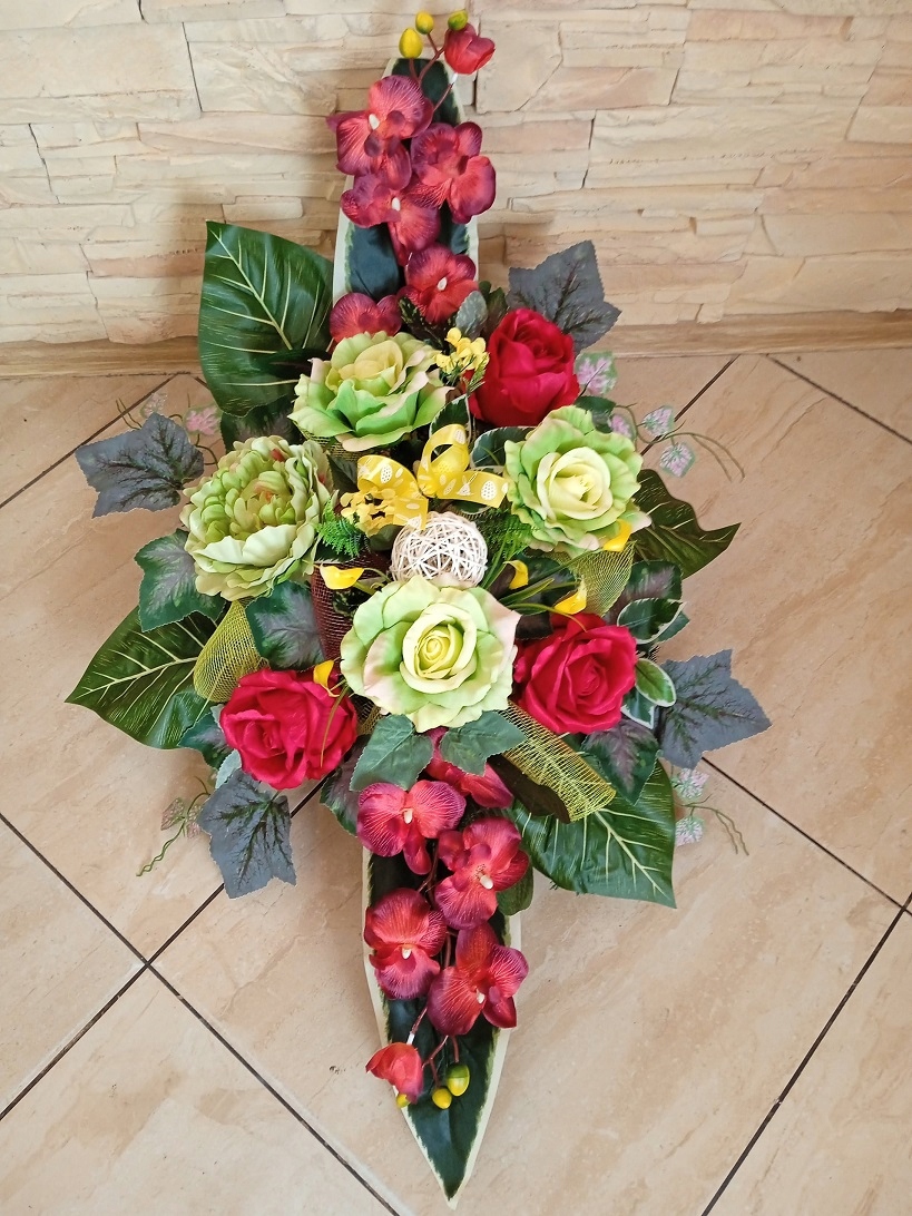 Искусственная композиция (так называемое украшение, икебана) размещается на надгробии изготавливается в пластиковом горшке длиной около 80 см и шириной 50 см.