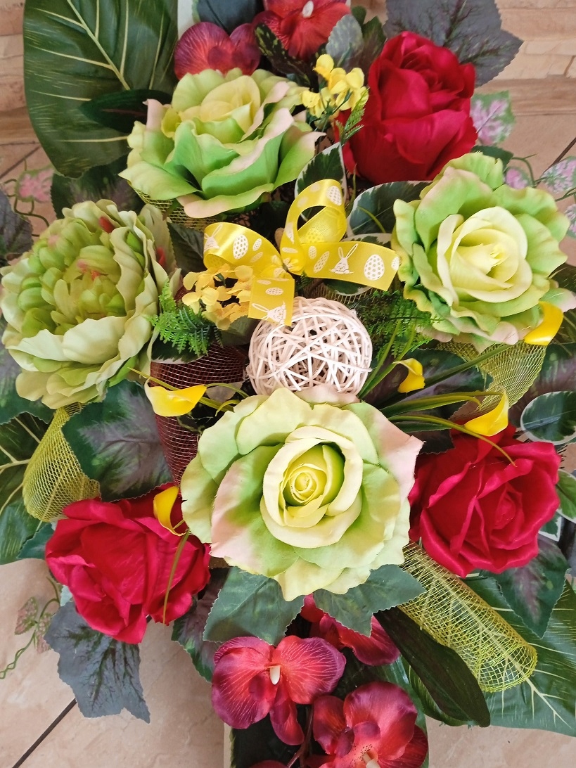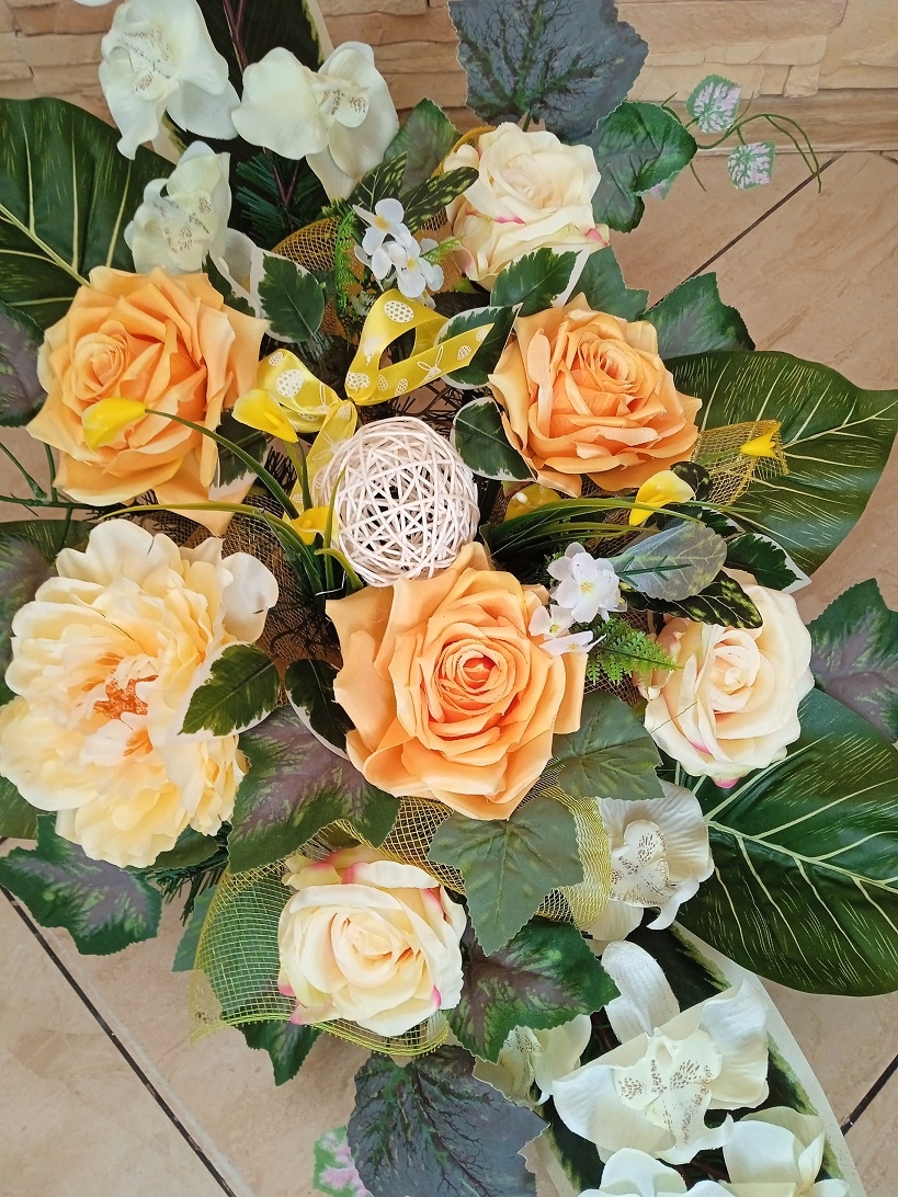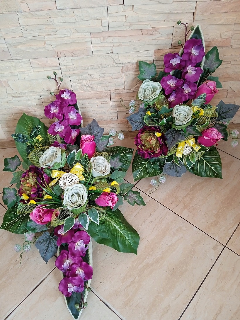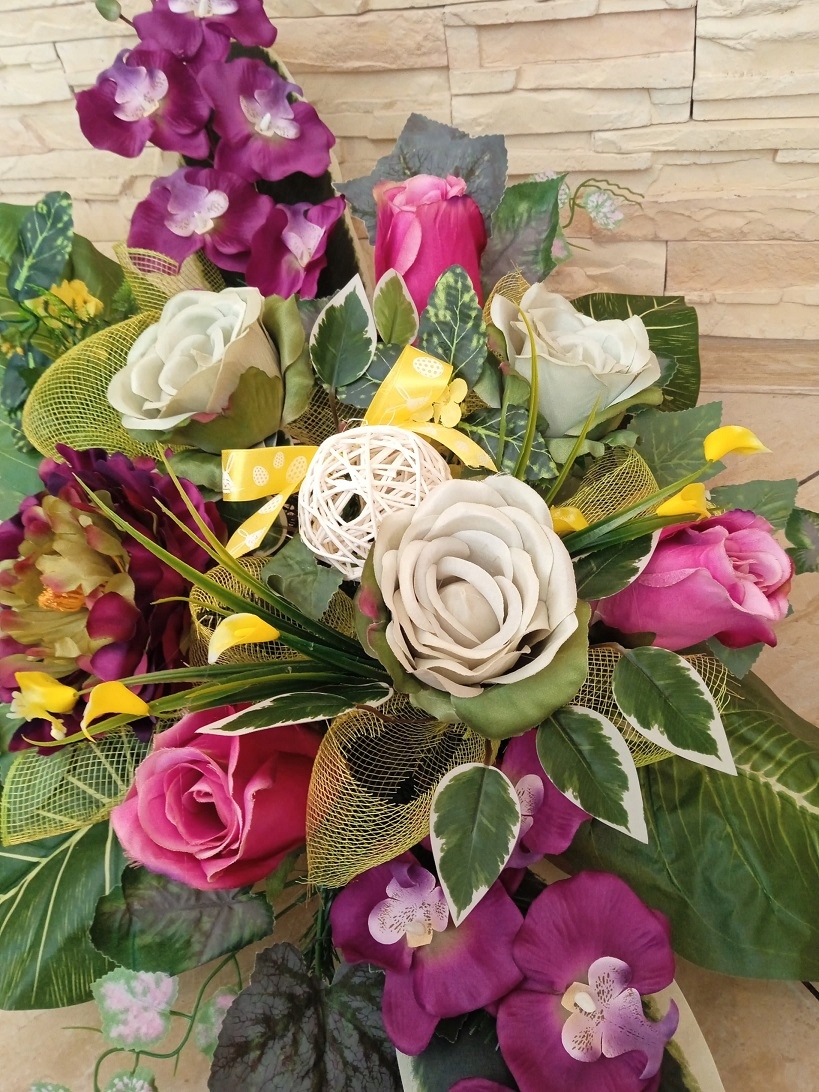 Искусственная композиция (так называемое украшение, икебана) размещается на надгробии изготавливается в пластиковом горшке длиной около 80 см и шириной 50 см.