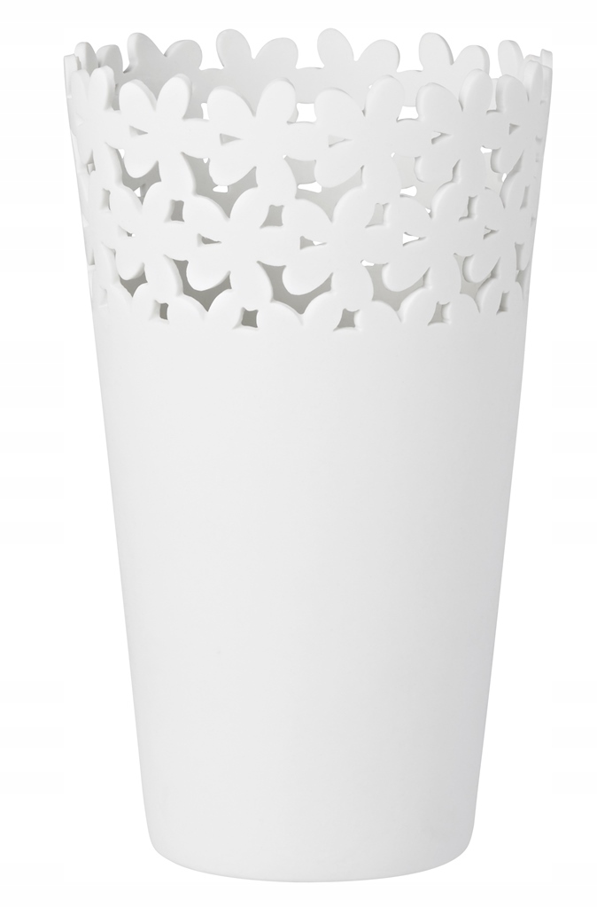 ваза, сделанная из белого фарфора, украшенная сверху с помощью схемы с открытой работой. Идеально подходит для маленьких букет.