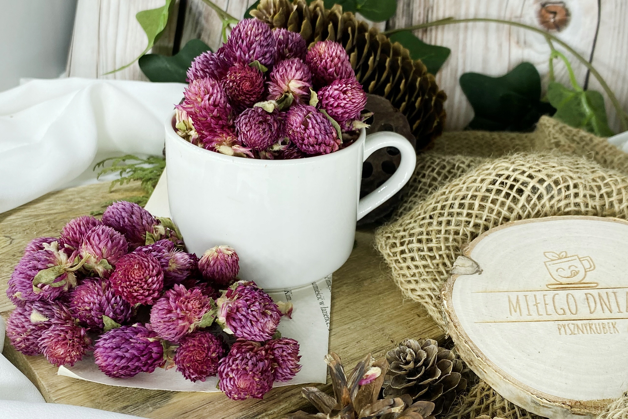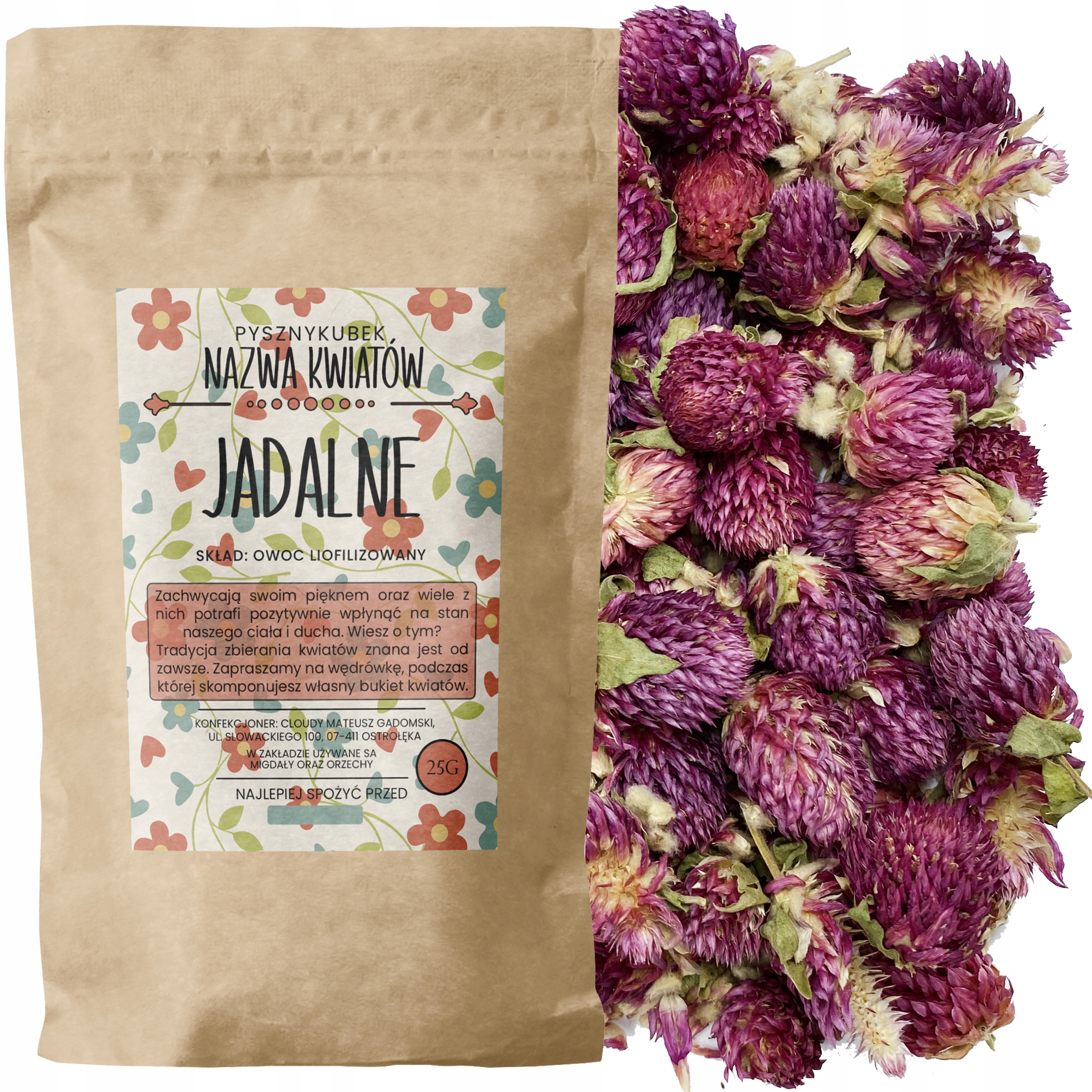 Или Гомфрена, однолетнее растение, малоизвестное в Польше. Родом он из Центральной Америки, но в наши дни его также можно встретить во многих тропических садах. Его разноцветные головки привлекают бабочек. Люди также оценили их красоту — на Гавайях из них создают характерные ожерелья. Высушенные цветки Гомфрены не теряют своего цвета – ими можно украшать выпечку, салаты и вторые блюда. Его можно добавить в настой любимого чая, придав ему свежий цветочный аромат. Цветки Вечного цветка шаровидного можно также залить кипятком без каких-либо добавок, и приготовленный таким образом настой порадует своим фиолетовым цветом и сладким вкусом. Лепестки, обладающие антистрессовыми и очищающими свойствами.