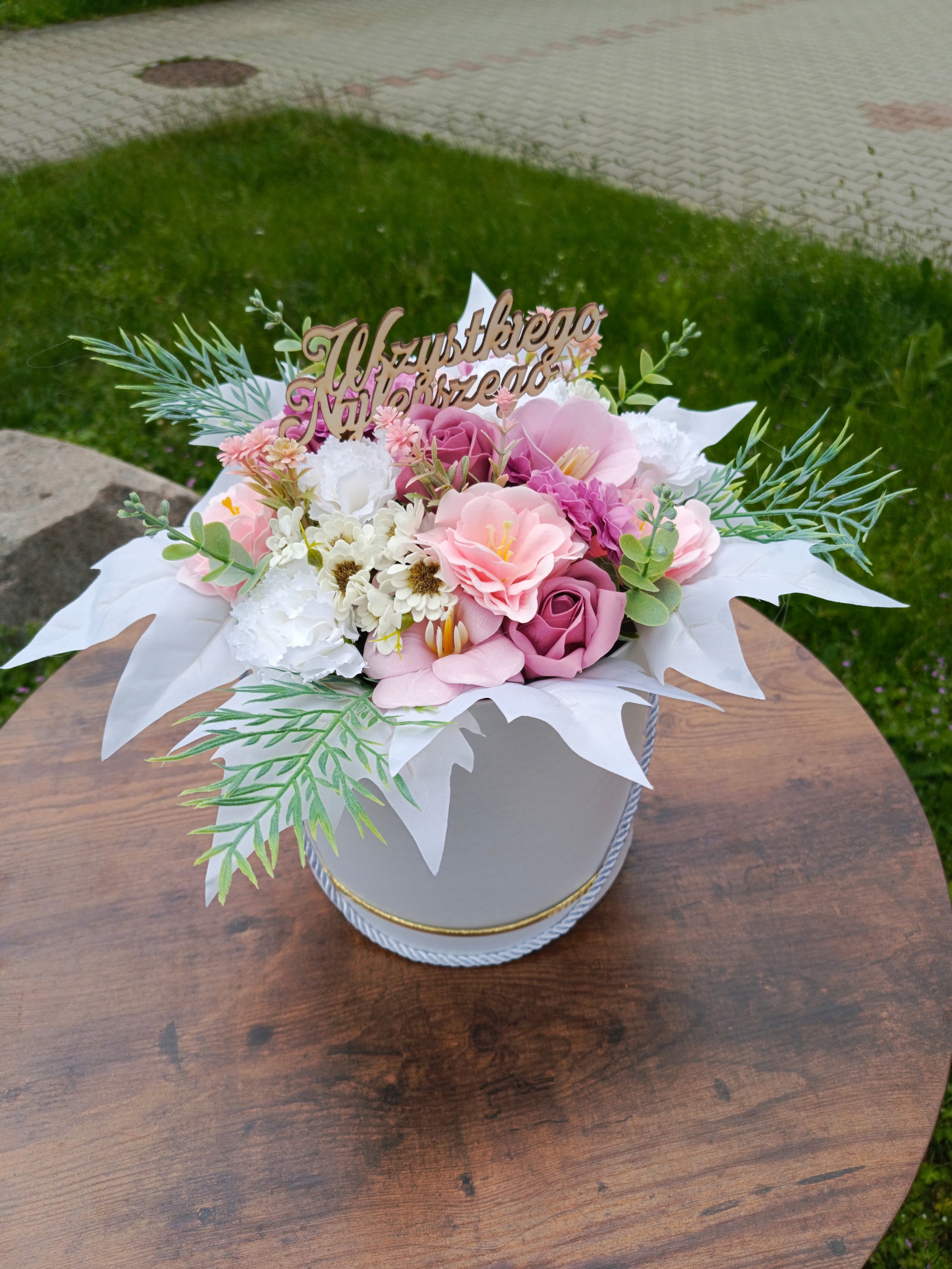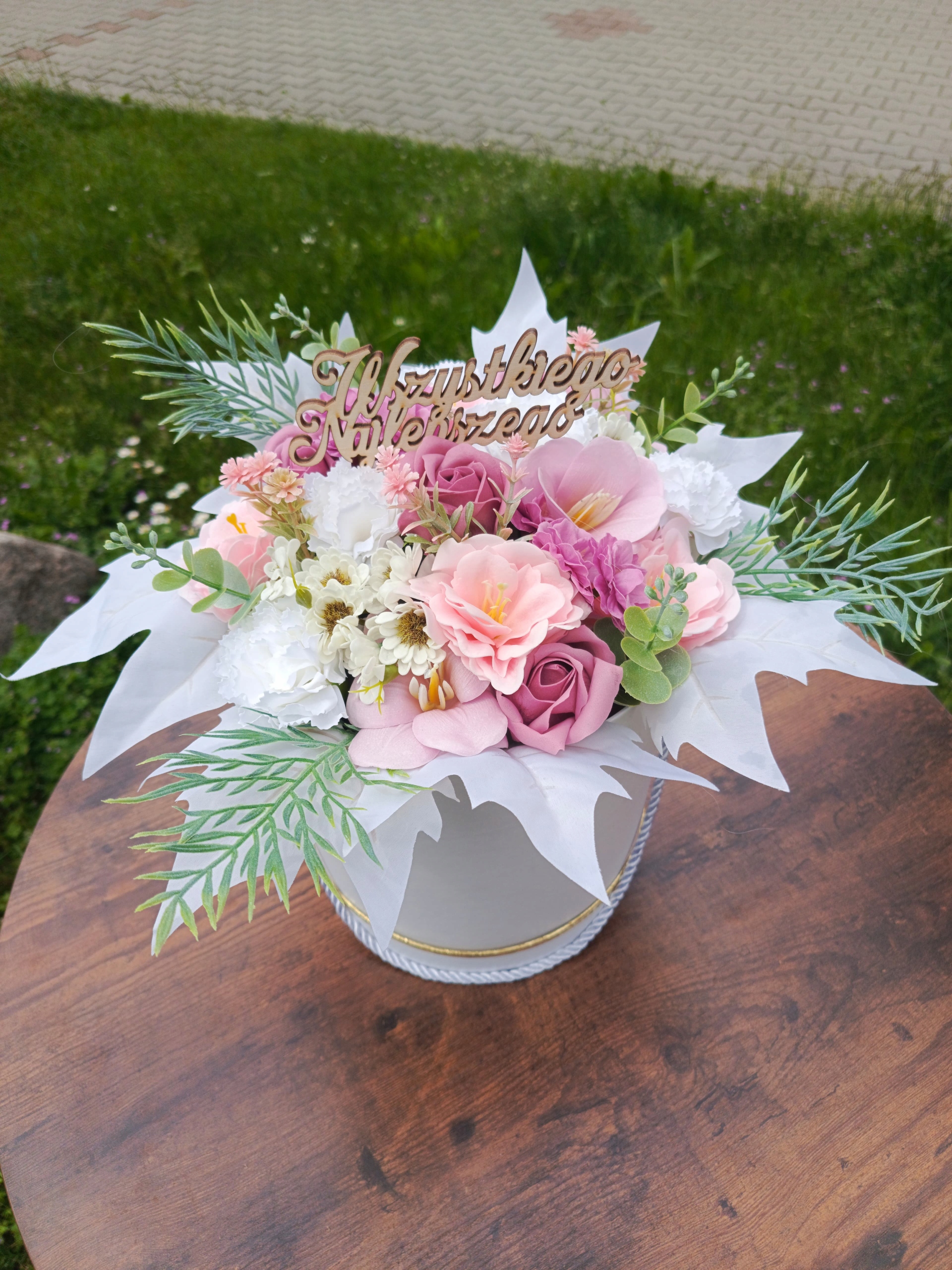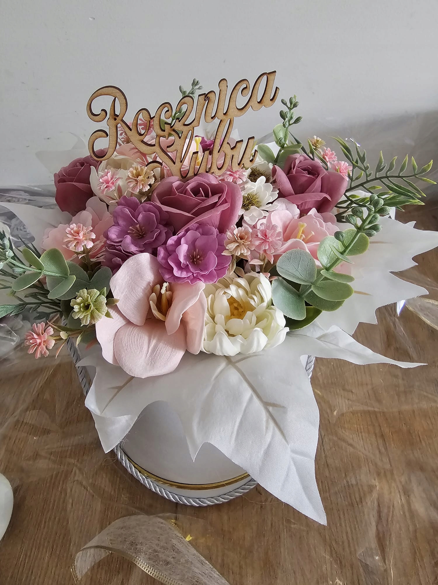 белая цветочная коробка с мыльными цветами с надписью Happy Best / годовщина свадьбы / в день свадьбы / спасибо, и мы благодарим вас и индивидуальную посвящение по запросу. И эстетический вид.