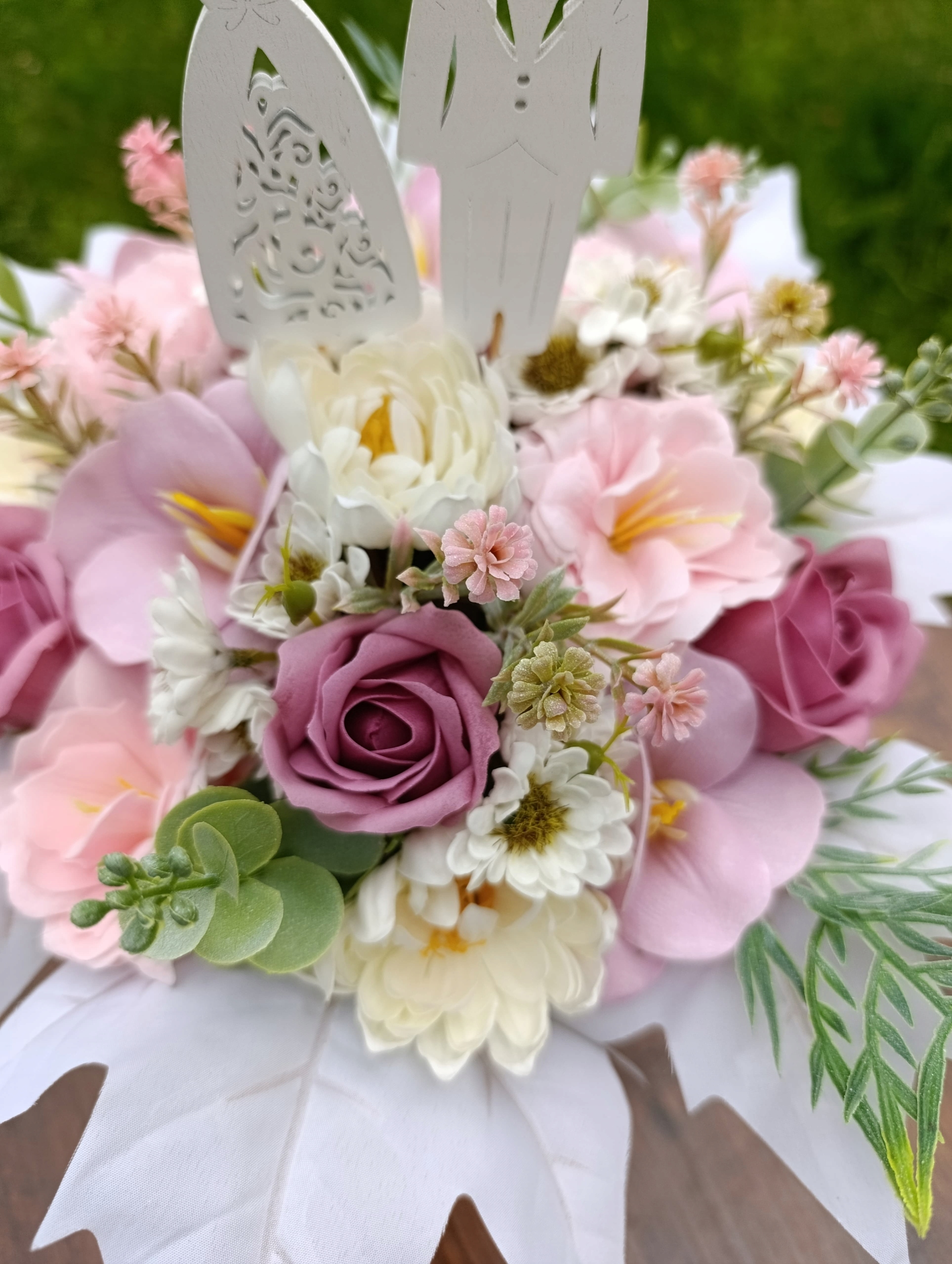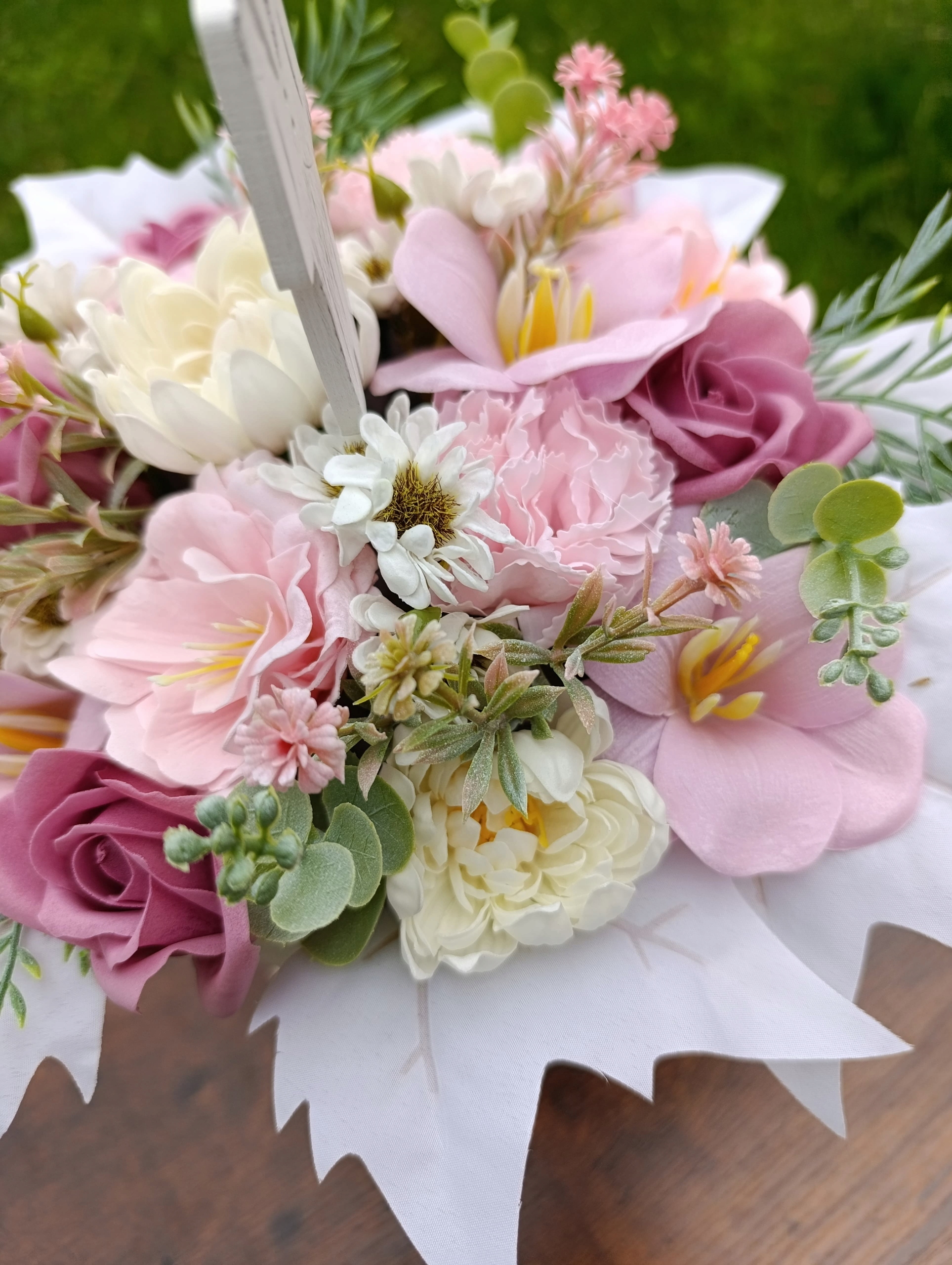 Композиция была изготовлена из высококачественных мыльных цветов и искусственных добавок, что гарантирует долговечность и эстетический вид.