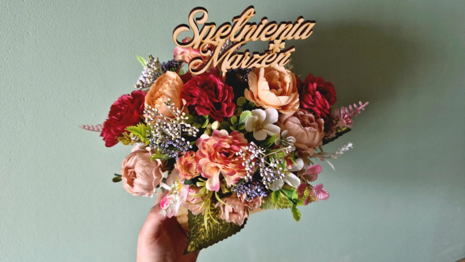 Букет находится в деревянной коробке с размерами 15x11x7 см (из которых 7 см. Высота)