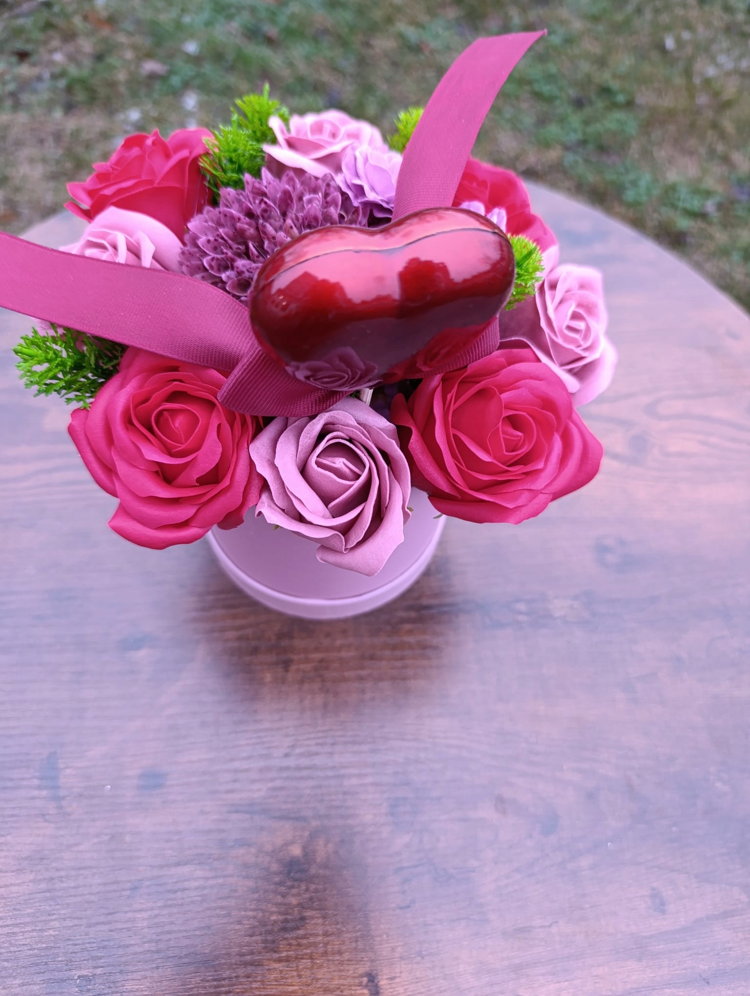 Композиция была сделана из высококачественных мыльных цветов и искусственных добавок, что гарантирует долговечность и эстетическую внешность. Разрежьте цветы
