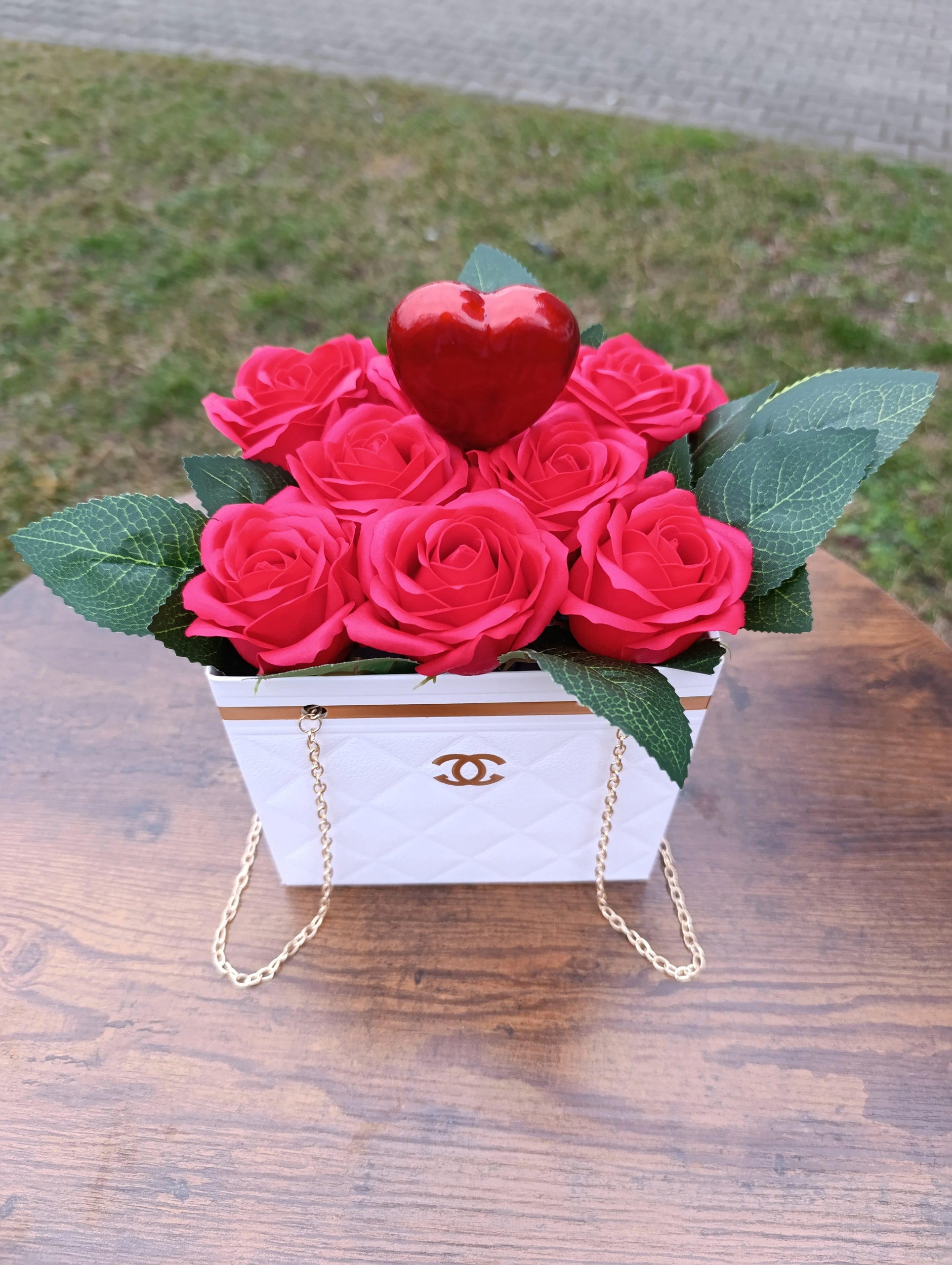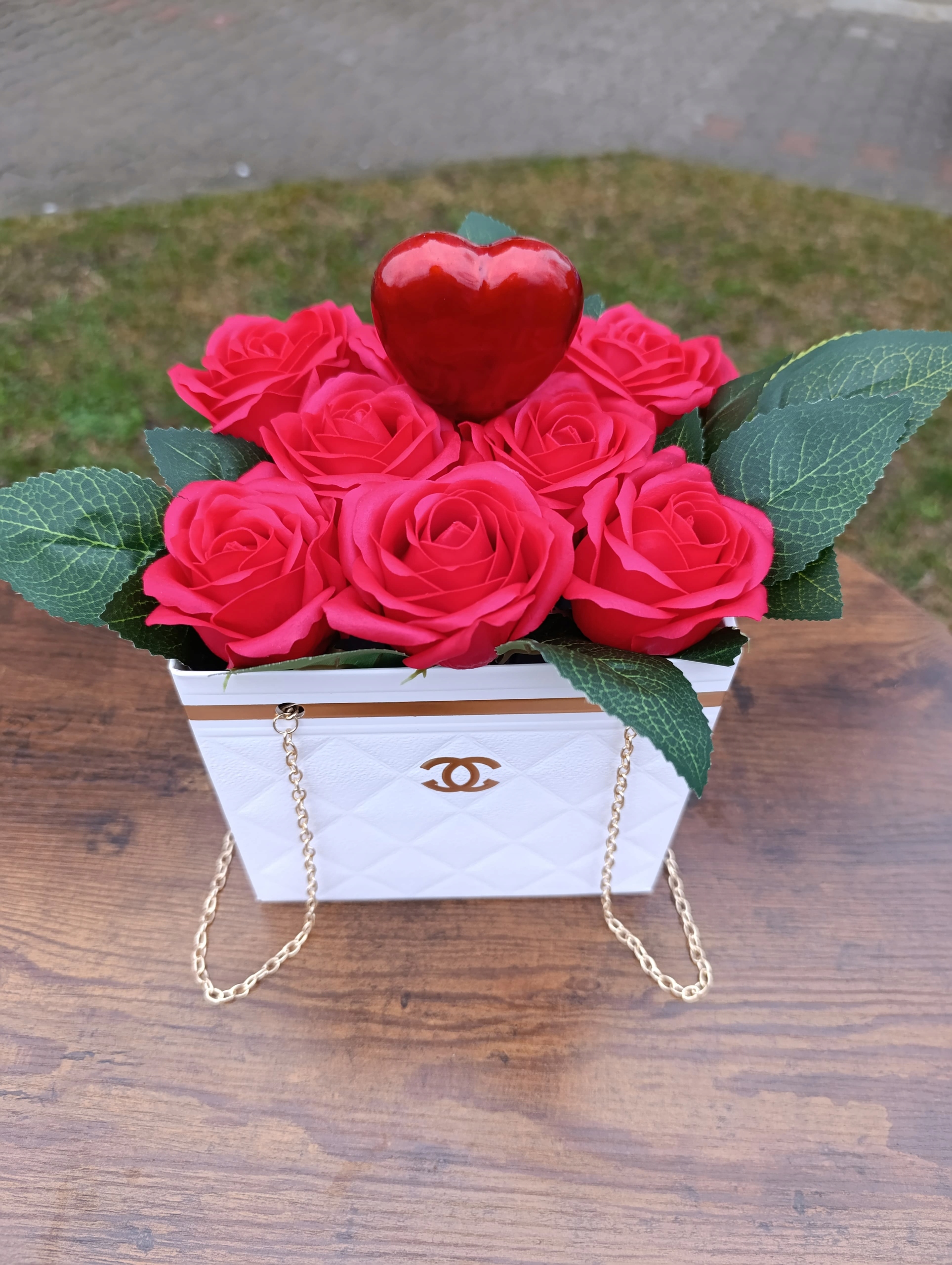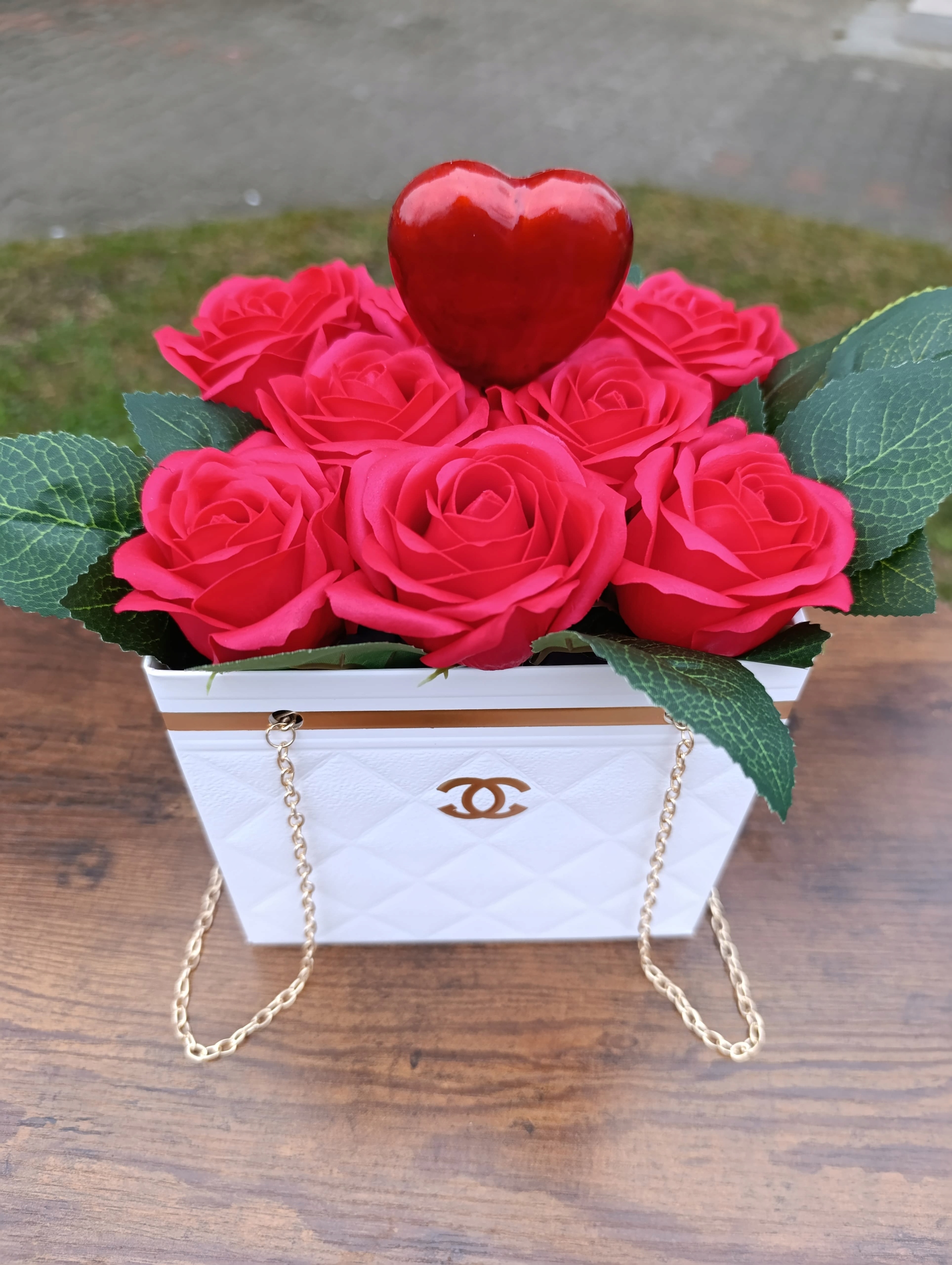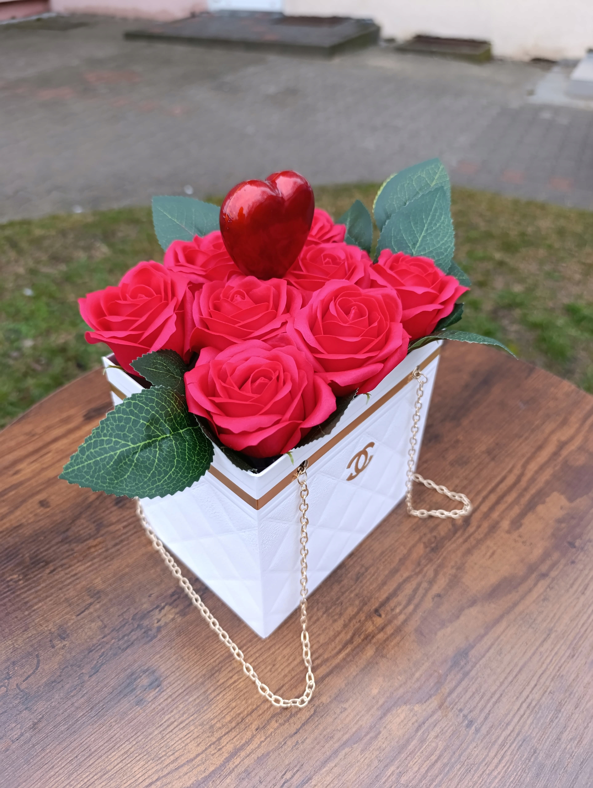 Оригинальная оригинальная композиция, изготовленная вручную в флористической мастерской 2.0 h2> белая цветочная коробка «La Chanel» с мыльными цветами и золотой цепью h2>