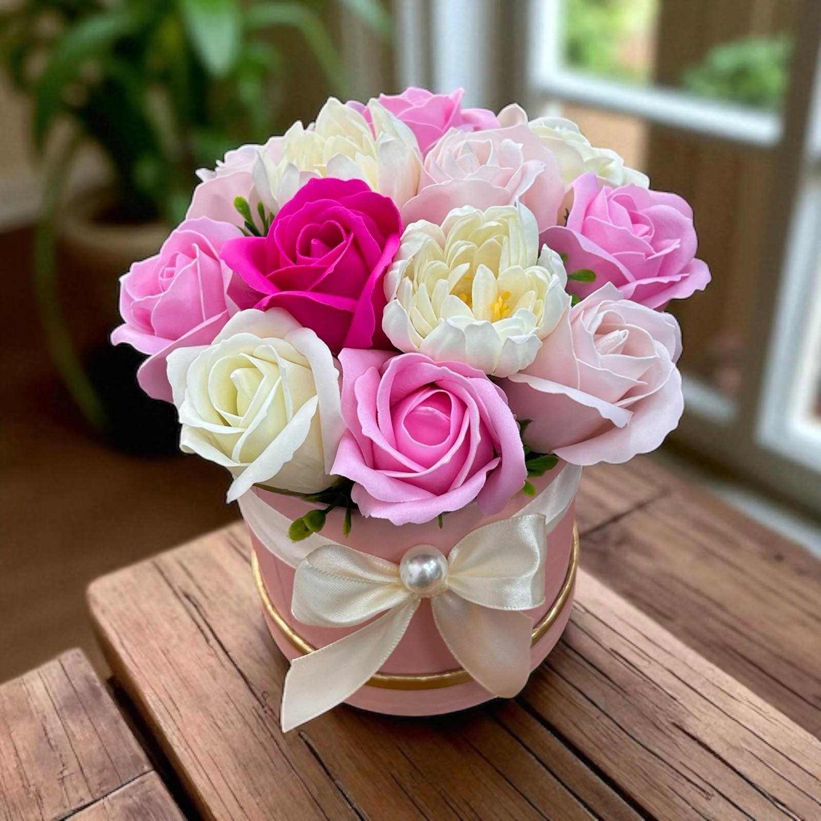 Эта декоративная коробка содержит красиво изготовленные мыльные цветы , которые выглядят как реальные, но вы можете использовать их для купания или украшения. Подарок , который сочетает в себе эстетику и функциональность в одном.