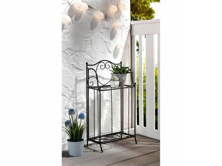 Фантастическая цветочная стенда идеально подходит для террасы, балкона или для гостиных. Полка, устойчивая к ультрафиолетовому излучению и погодным условиям с ногами, защищающими пол, устойчивый к коррозии. Крелковая полость имеет внешние размеры 34,5 х 18,5 х 65 см. Каждая полка имеет размеры 31 х 16 см.