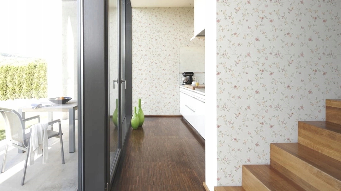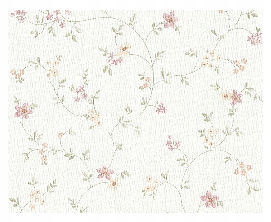Основные цвета на обоях: фон оттенка «грязно-белый».Цветки оттенков зеленого, красного, желтого.