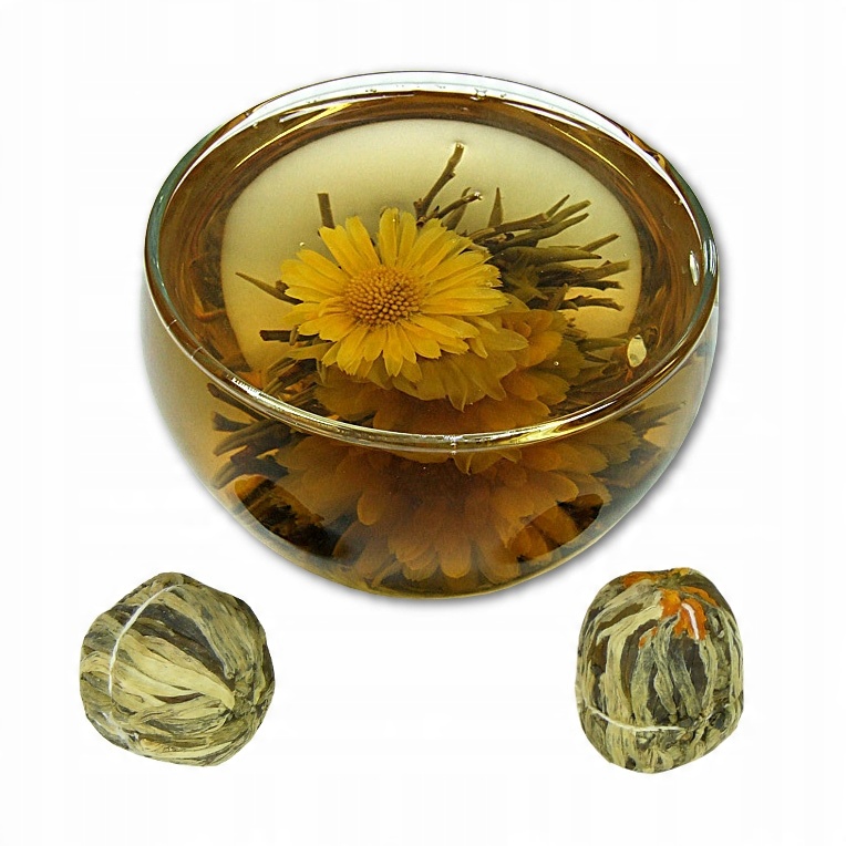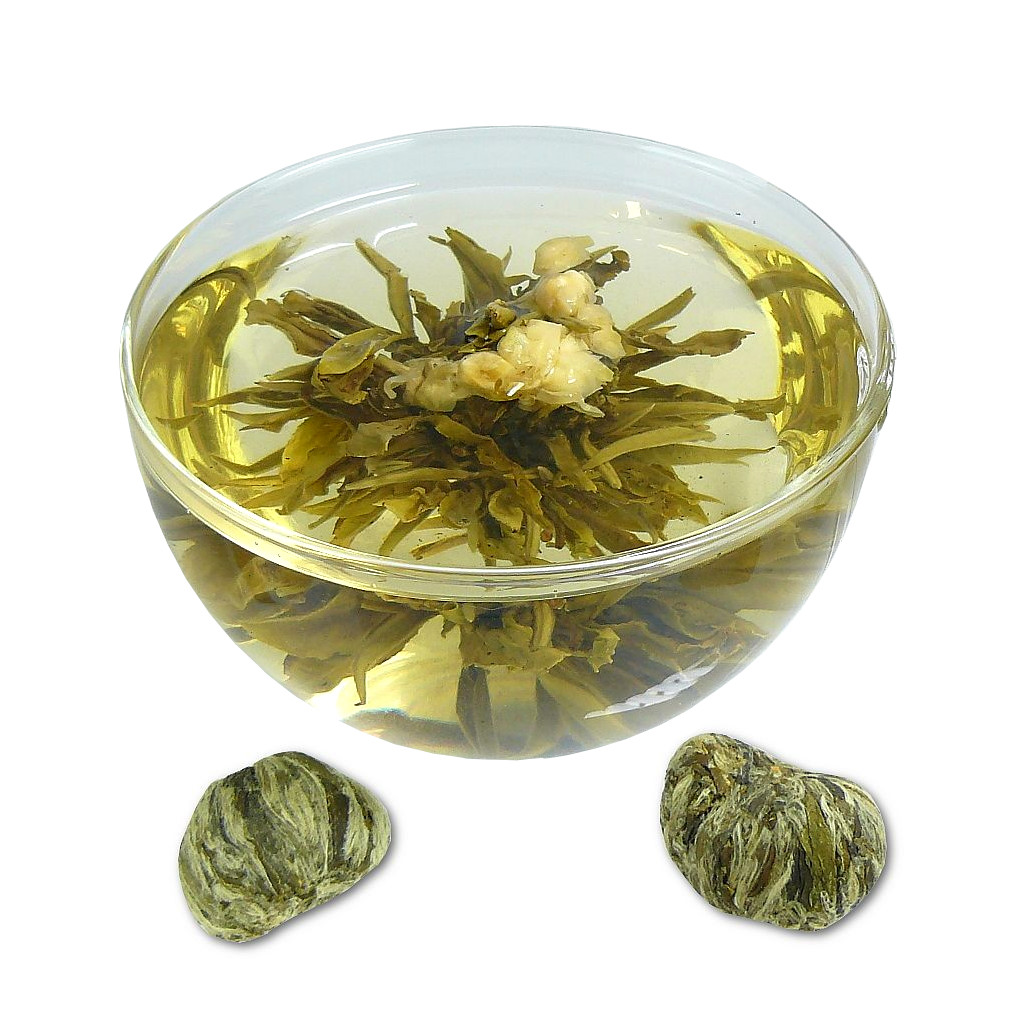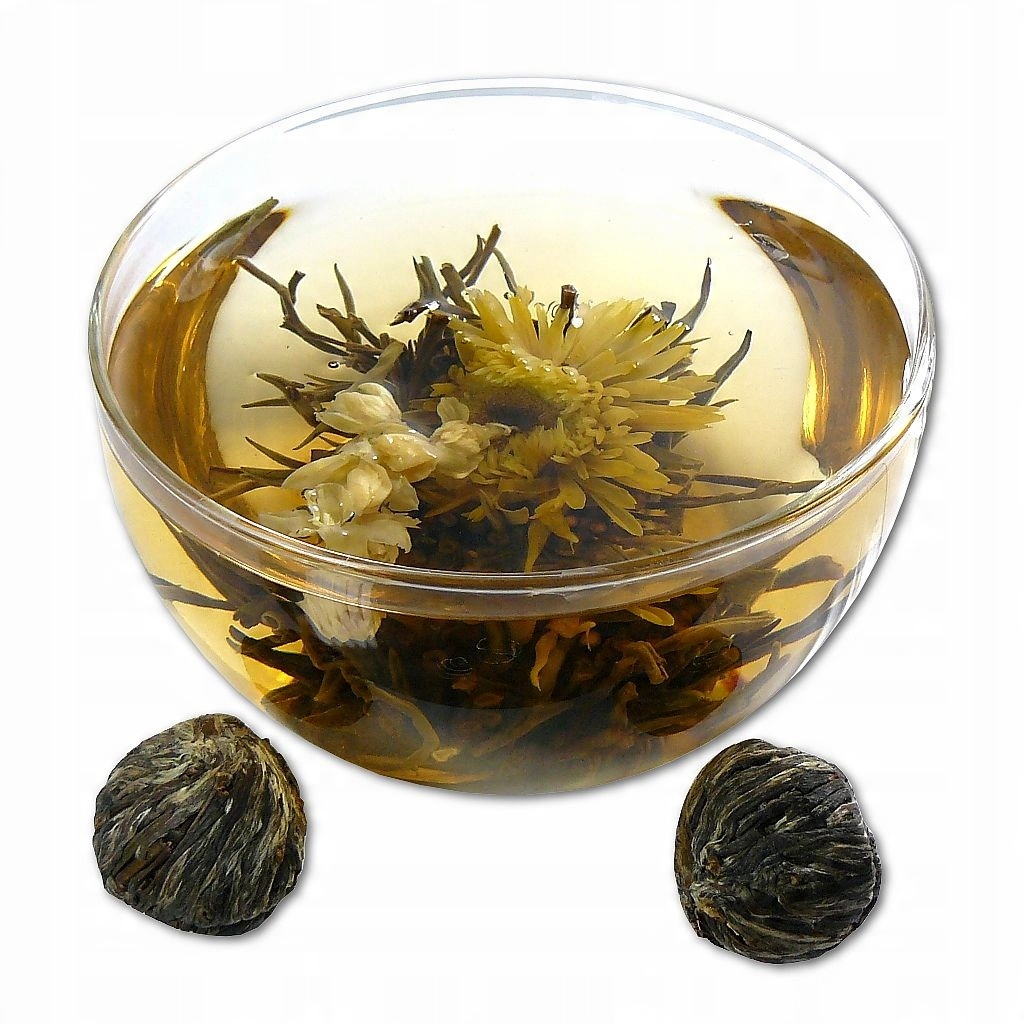 Отличное качество, скрученные вручную чаи на основе белого и зеленого листового чая. Белый и зеленый чай, цветущий из Китая, гарантирует превосходный, нежный вкус с легкой фруктовой или цветочной ноткой и необыкновенное эстетическое наслаждение. После заливки воды зеленые и серебристые листья медленно раскрываются, выпуская изнутри красивые композиции из 1-3 цветков. Настой имеет светло-желтый цвет и превосходный, очень тонкий вкус с едва заметной травяной ноткой, а также обширные оздоровительные свойства. В упаковке 6 разных чайных шариков из списка (в случайном порядке в зависимости от наличия): Королева Востока, Восточная красавица, Калебаш, Цветущий Камю, Орхидея Амарант, Жасминовый жемчуг, Золотой шарик, Серебряный шарик - описания и фото на других наших аукционах.< / п>