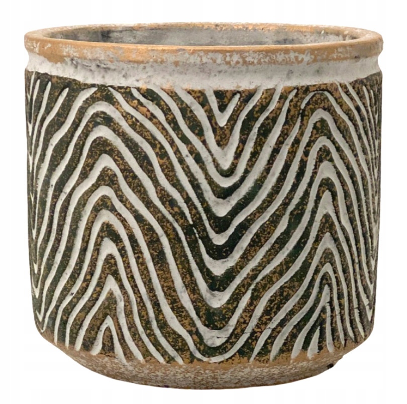 Большой вазон из цемента в оттенках грязно-бежевого и золотого, стенки которого украшены мотивом черных тигровых полос. В традициях восточных культур тигры являются символом власти и силы, а также необычайной защитной энергии. Этот оригинальный вазон привлечет внимание и тонко впишется в любой интерьер, создавая приятный контраст с любым зеленым растением. Отверстия для слива воды не имеет.