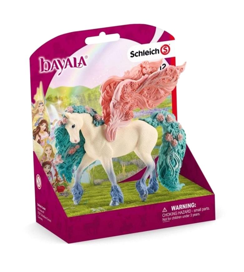 из серии Schleich(R) имеет пышную цветочную гриву и хвост, живет с милым цветочным жеребенком-единорогом среди чудесных цветочных полей Баялы(R) и является другом королевских сестер. Ему нравится встречаться с принцессой Сурой у водопада. Удивительно красочный цветочный пегас из серии Schleich(R) Bayala(R) – волшебное животное. Он такой же застенчивый и загадочный, как и все единороги. Он живет вдали от проторенных дорог среди прекрасных цветочных полей Баялы и является заботливым опекуном жеребенка сладкого цветочного единорога. Завоевать его доверие очень сложно. И все же царственным сестрам удалось обрести в нем хорошего и верного друга. Принцессы Сура и Сера любят встречаться с ним и восхищаться его красивыми крыльями и великолепной гривой! Цветочный пегас всегда чихает, когда чувствует запах определенного цветка. Затем жеребенок смеется и ржет.