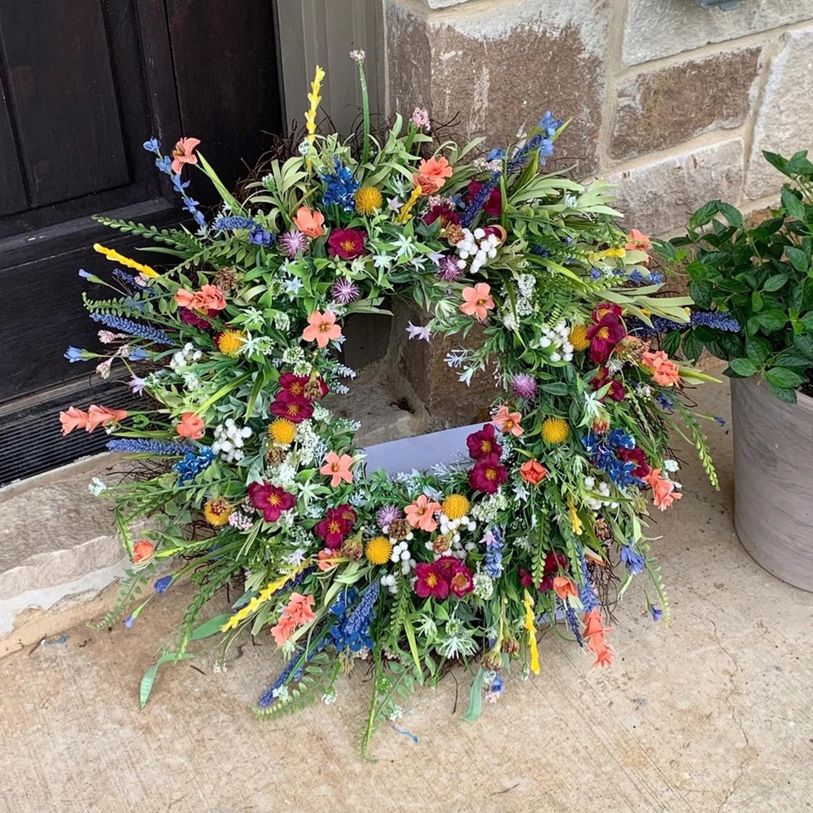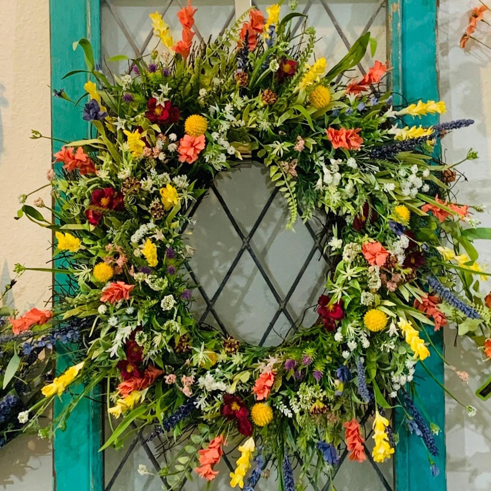 Искусственный весенний венок на дверь, хорошо сделанный и яркие цвета, выглядит реалистично и красиво.