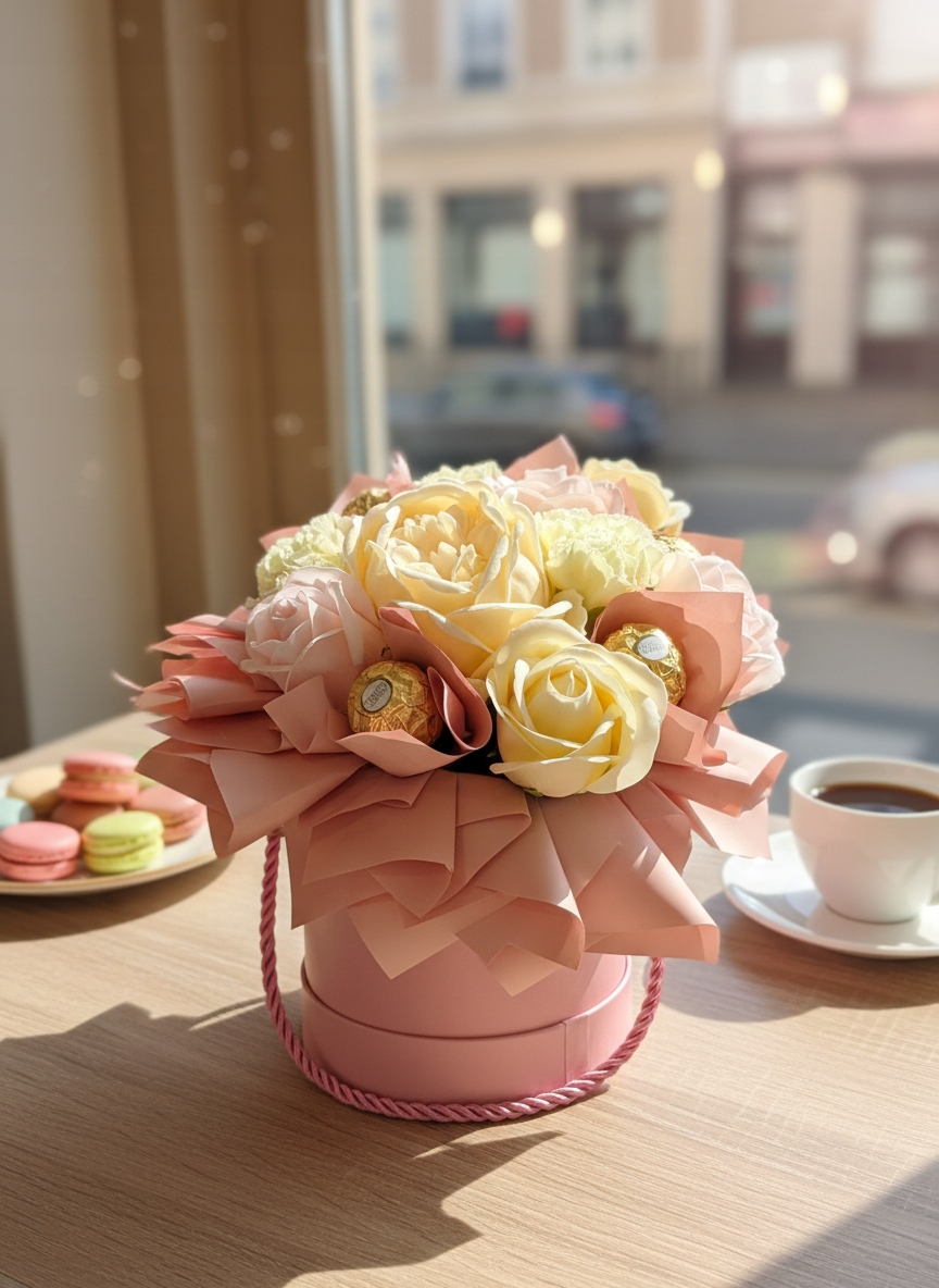 Цветочная коробка с мыльными цветами и пралины Ferero Roscher - пастельная смесь элегантности и расслабления