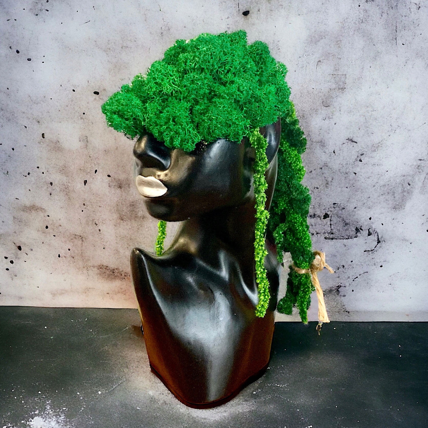 горшок, изготовленный из художественного бетона в форме бюста женщины, был наполнен стабилизированным мхом с царапиной и амарантом, который напоминает волосы во всей композиции. Украшение очень элегантно, изящно, с небольшим количеством восточного характера.