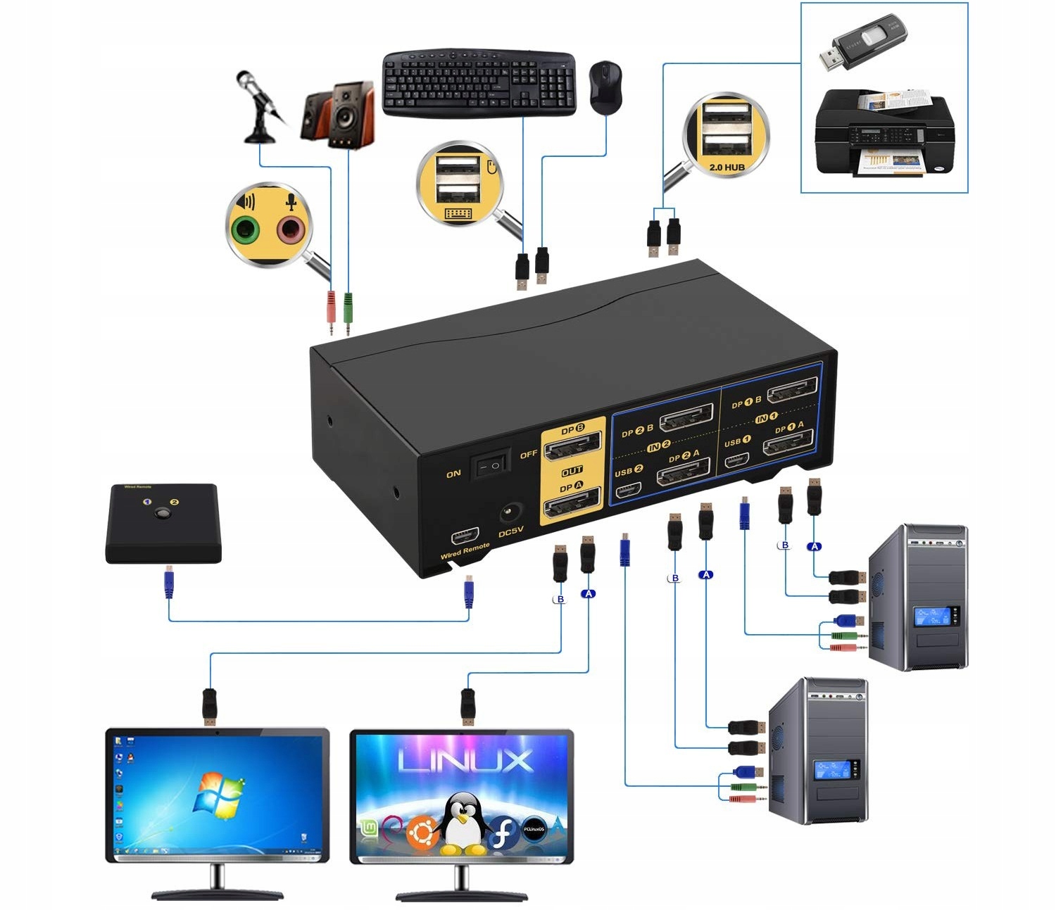 (Советы: этот переключатель KVM не находится в версии DP1.2 60 Гц, он не совместим с устройствами в версии DP1.4, 100 Гц, 120 Гц, 144 Гц)