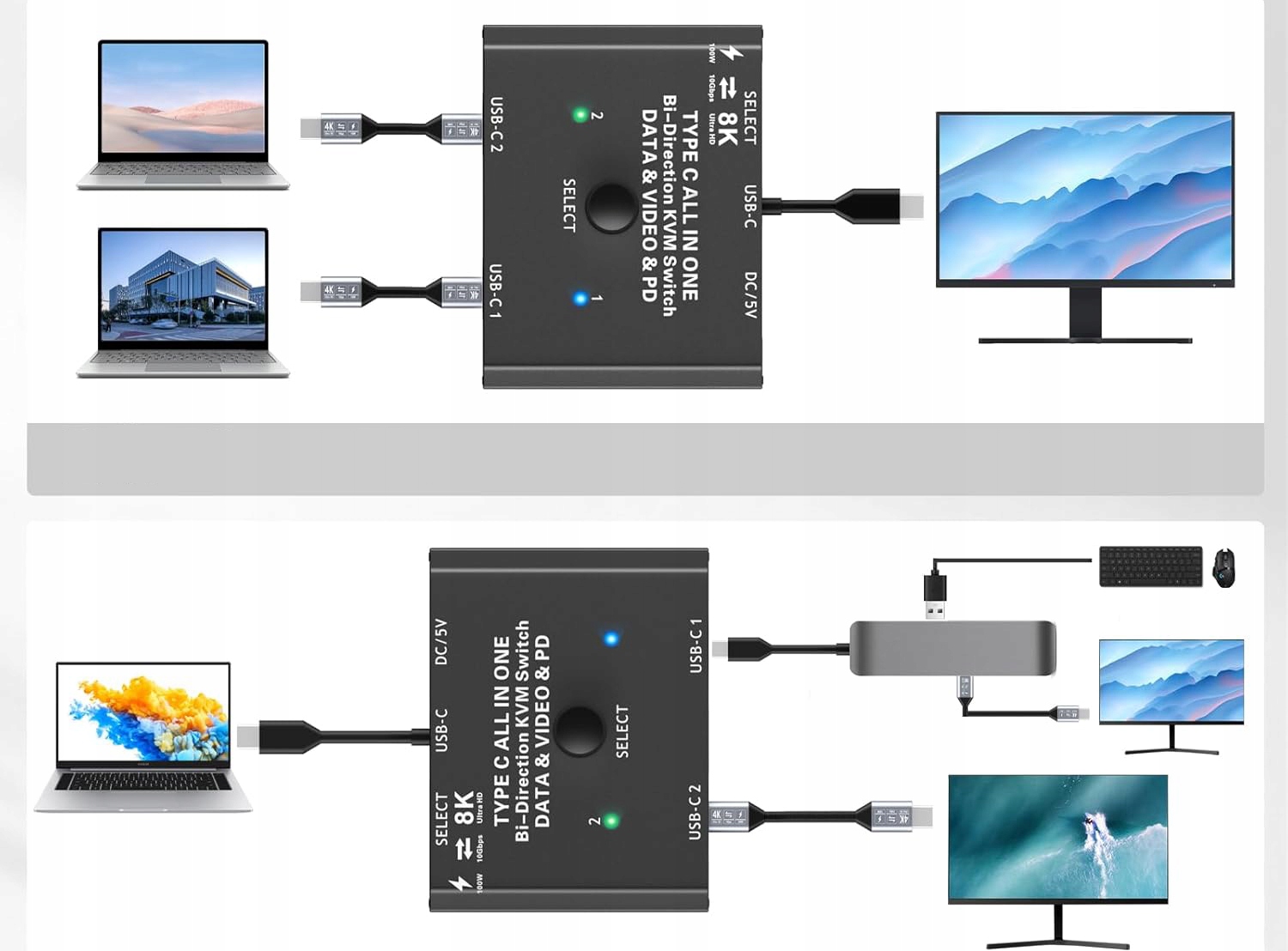 Широкая совместимость - коммутатор USB C / ветвь совместим с Windows / XP / Vista / Chrome / Mac OS / Linux. Совместим с большинством устройств Thunderbolt 3. KVM 2 ПК 1 ПК ПК ПЕКТА 1 USB C Монитор поддерживает большинство входных устройств с интерфейсом USB C.