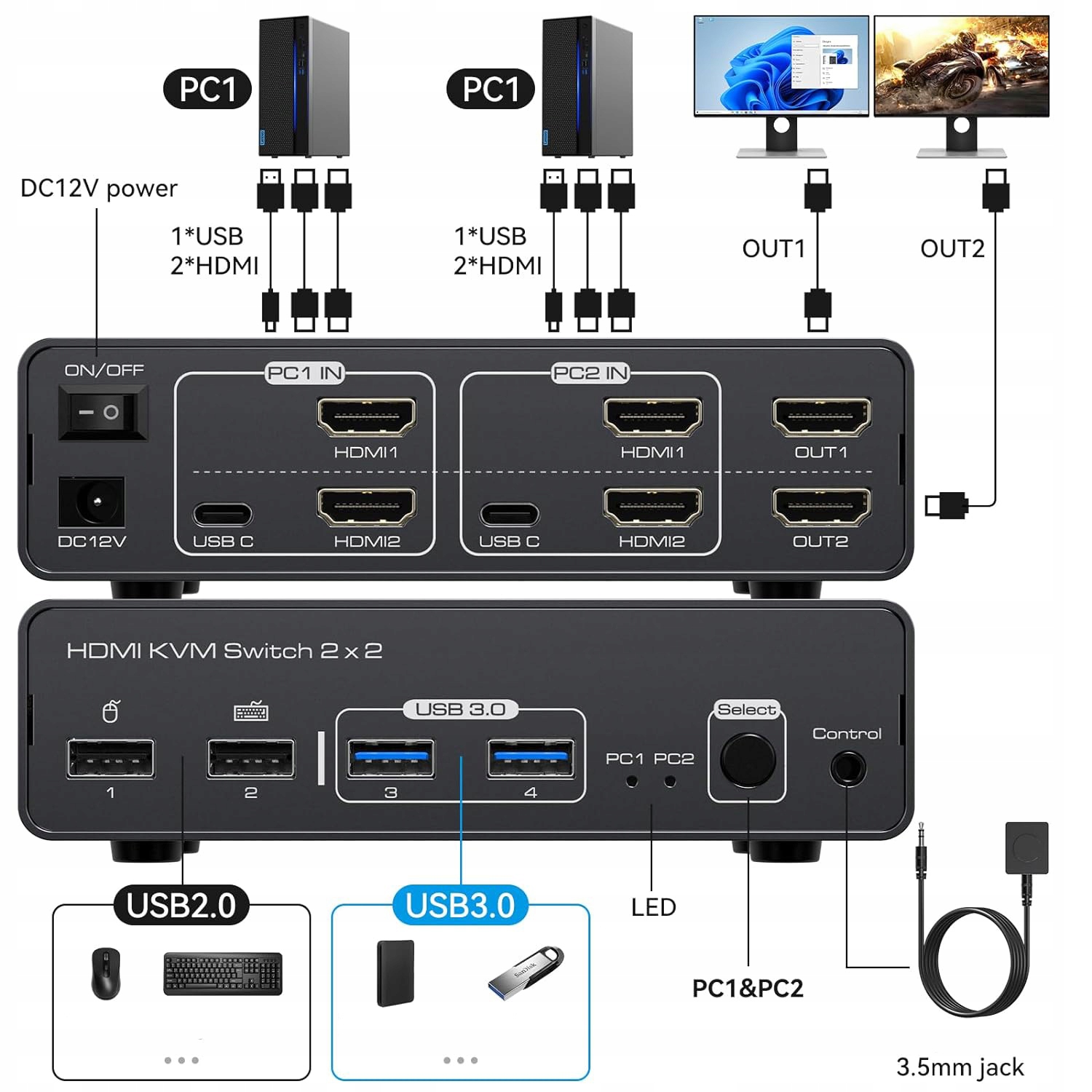 【KVM Переключатель 2 Мониторы 2 Компьютеры】 Переключатель KVM Двойной монитор позволяет управлять 2 компьютерами или ноутбуками, используя один набор клавиатуры и мыши, разделяя 4 USB -устройства и 2 монитора. Чтобы использовать этот переключатель KVM, каждый ноутбук должен поддерживать более двух мониторов. Примечание. Порт USB C может отправлять только данные, порт HDMI используется для отправки изображения. Если вы хотите отобразить изображение с двух компьютеров на двух мониторах, порты HDMI1 и HDMI2 на продукте должны быть подключены к одному компьютеру