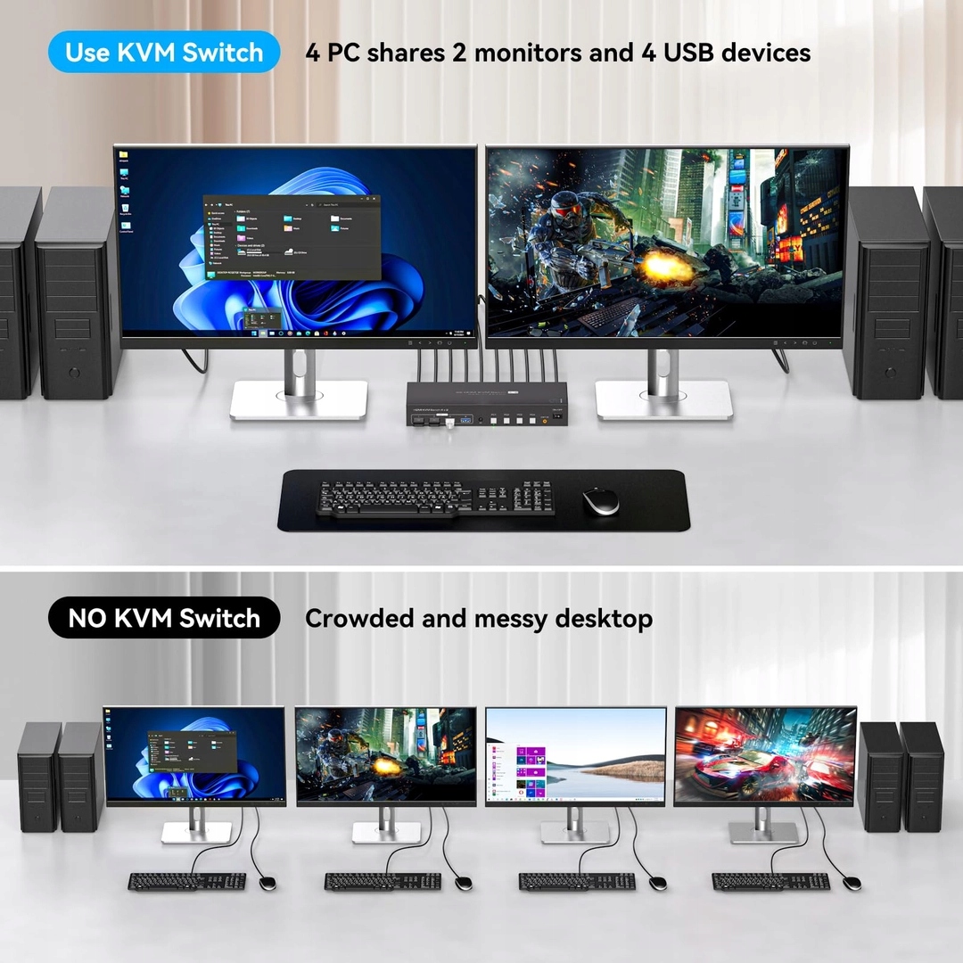 Откройте для себя возможности, предлагаемые kvm vpfet 4k . Благодаря этому вы можете легко управлять целых четырьмя компьютерами одновременно, используя два монитора HDMI . Вам больше не нужно переключать кабели или тратить время на замену устройств - все у вас под рукой.