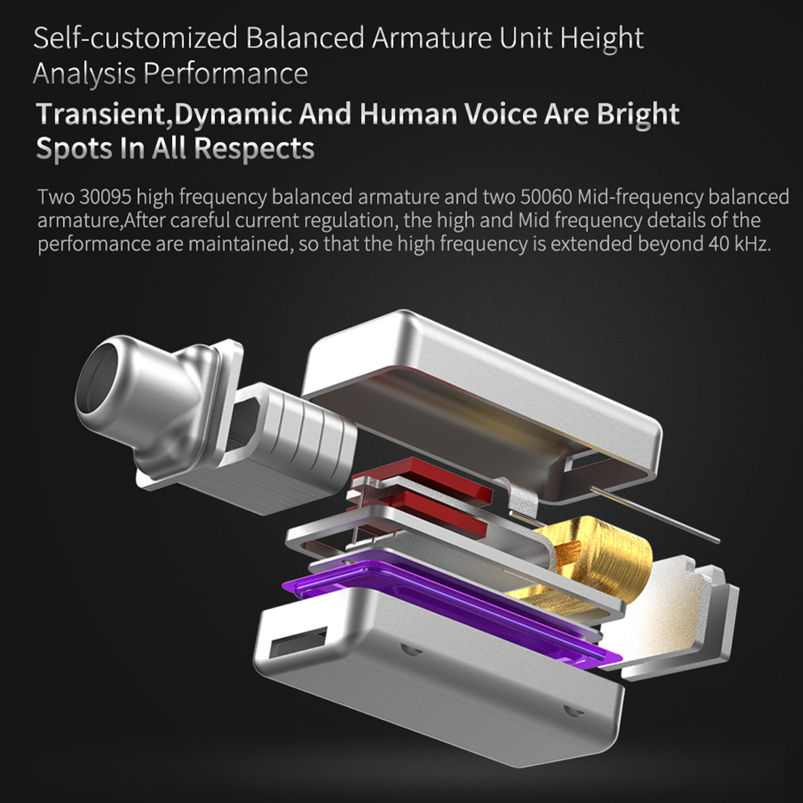 - 1 динамический и 4 сбалансированных арматуры с каждой стороны, всего 10 динамиков, объединяющих широкое звуковое поле и высокое разрешение, обеспечивающие глубокие басы и захватывающий высокий тон.