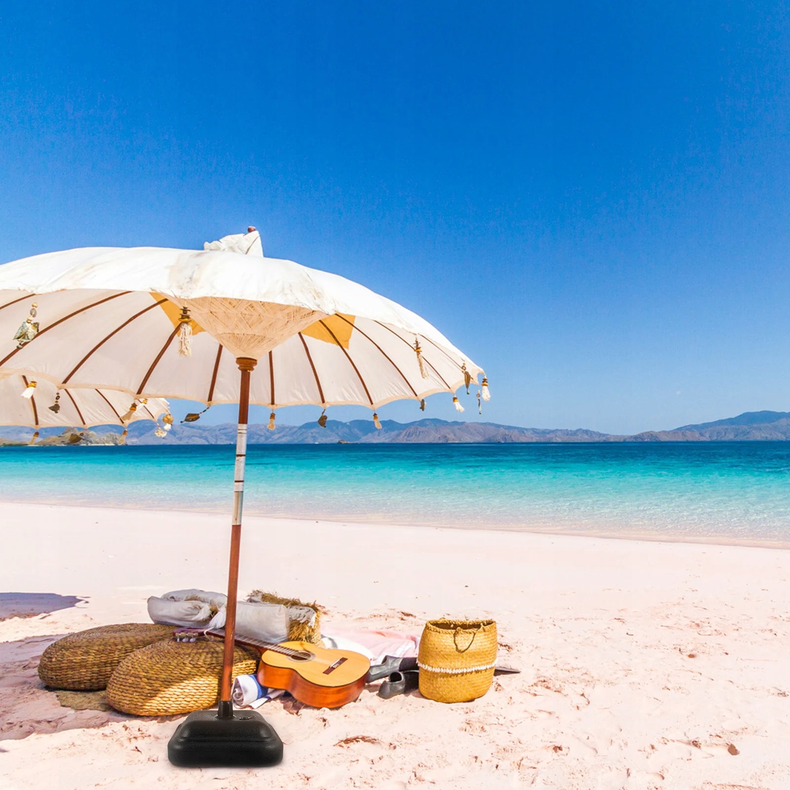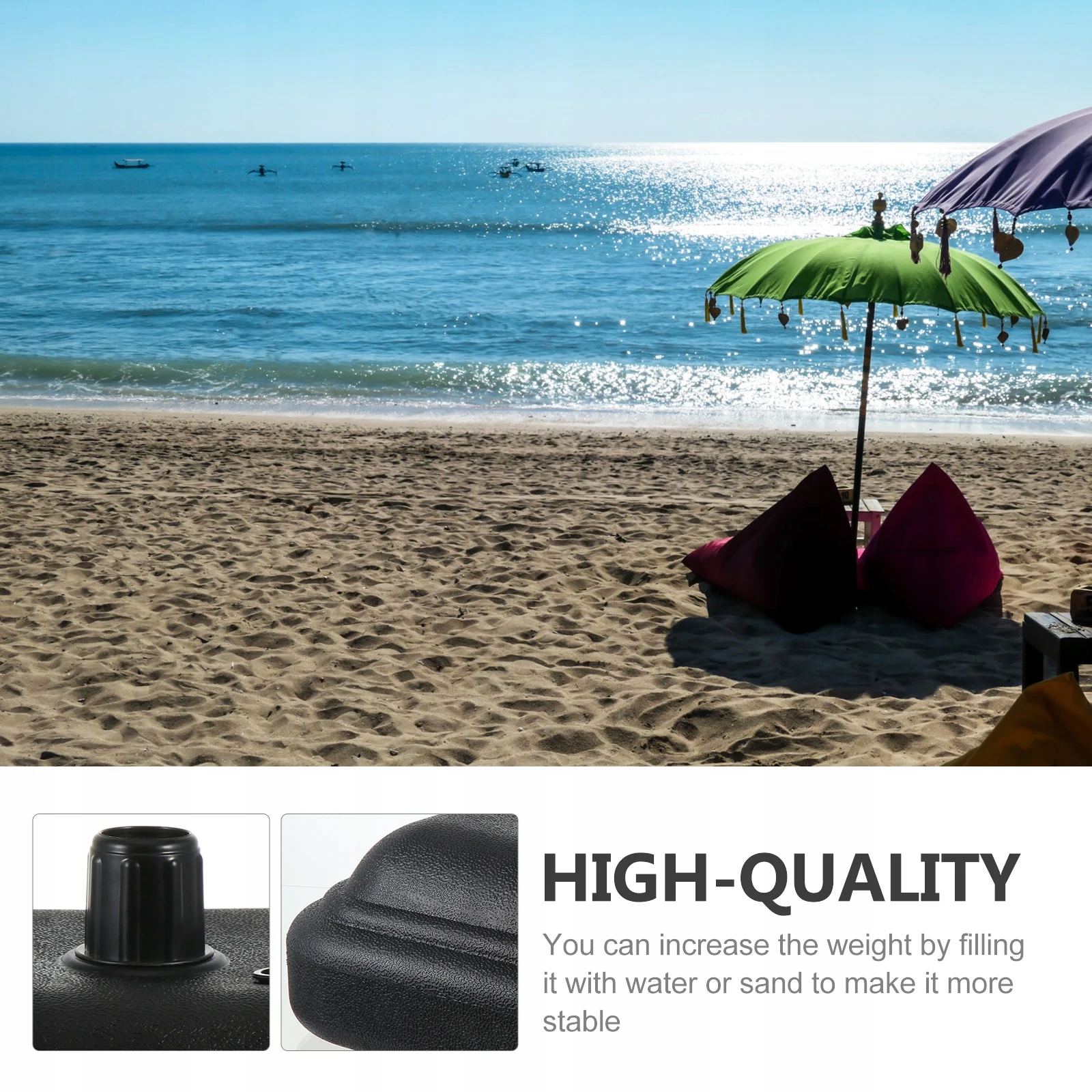 Основа зонта изготовлена из пластика, безопасного и нежного, прочного и долговечного, с отличной текстурой, может использоваться в течение длительного времени. Вы можете увеличить вес, наполнив его водой или песком, чтобы сделать его более устойчивым. Он имеет простой метод применения и достаточно силен. Это идеальный постоянный солнцезащитный зонтик для вашего домашнего сада и пляжа.
