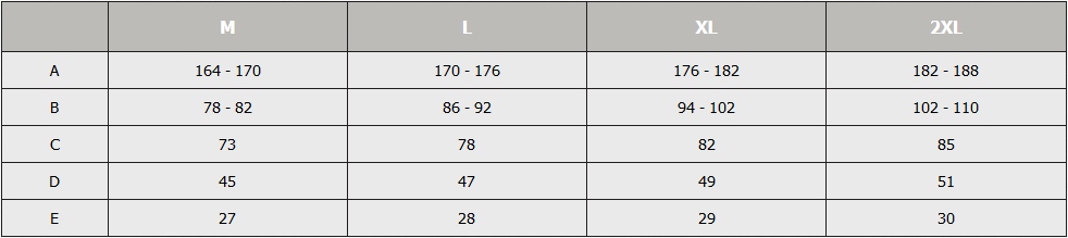 C - окружность талии [см] | D - окружность голени [см] | E - длина ноги [см]
