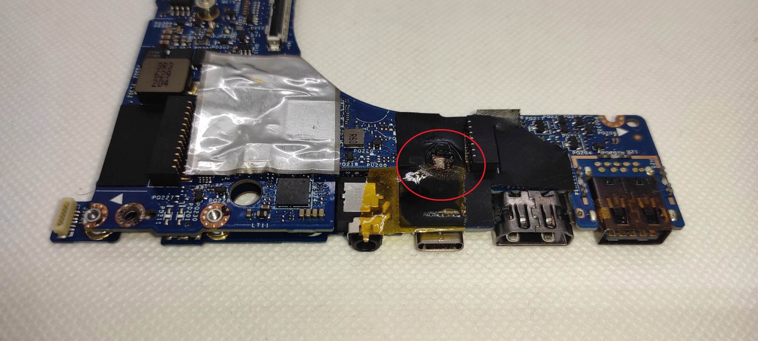 Предмет продажи — поврежденная материнская плата LA-C361P для ноутбука DELL XPS 15 9550. Процессор Intel Core i7-6700HQ, встроенная графика Intel и выделенная видеокарта Nvidia GeForce GTX 960M. После заливки плата не реагирует на подачу питания. Визуальное состояние соответствует фотографиям, видимые следы затопления и повреждения вокруг порта USB-C (фото).