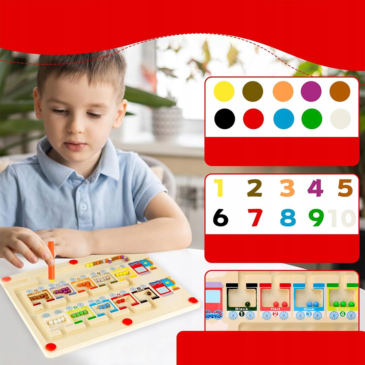 В состав этой игрушки-магнитного лабиринта входят 10 машинок разного цвета, каждая из которых соответствует цифрам от 1 до 10, и 55 магнитных бусин 10 ярких цветов (по 5 каждого цвета). Дети могут использовать магнитную палочку, чтобы перемещать бусинки по лабиринту и направлять их к машинкам с соответствующим номером и цветом, развивая таким образом зрительно-моторную координацию и ловкость пальцев.