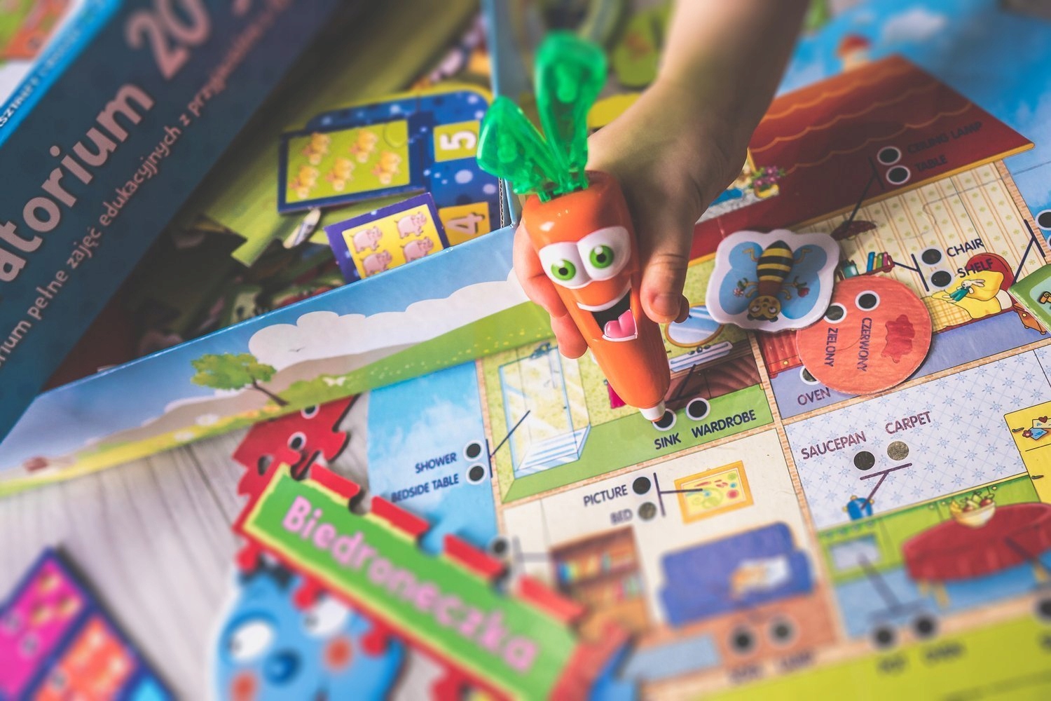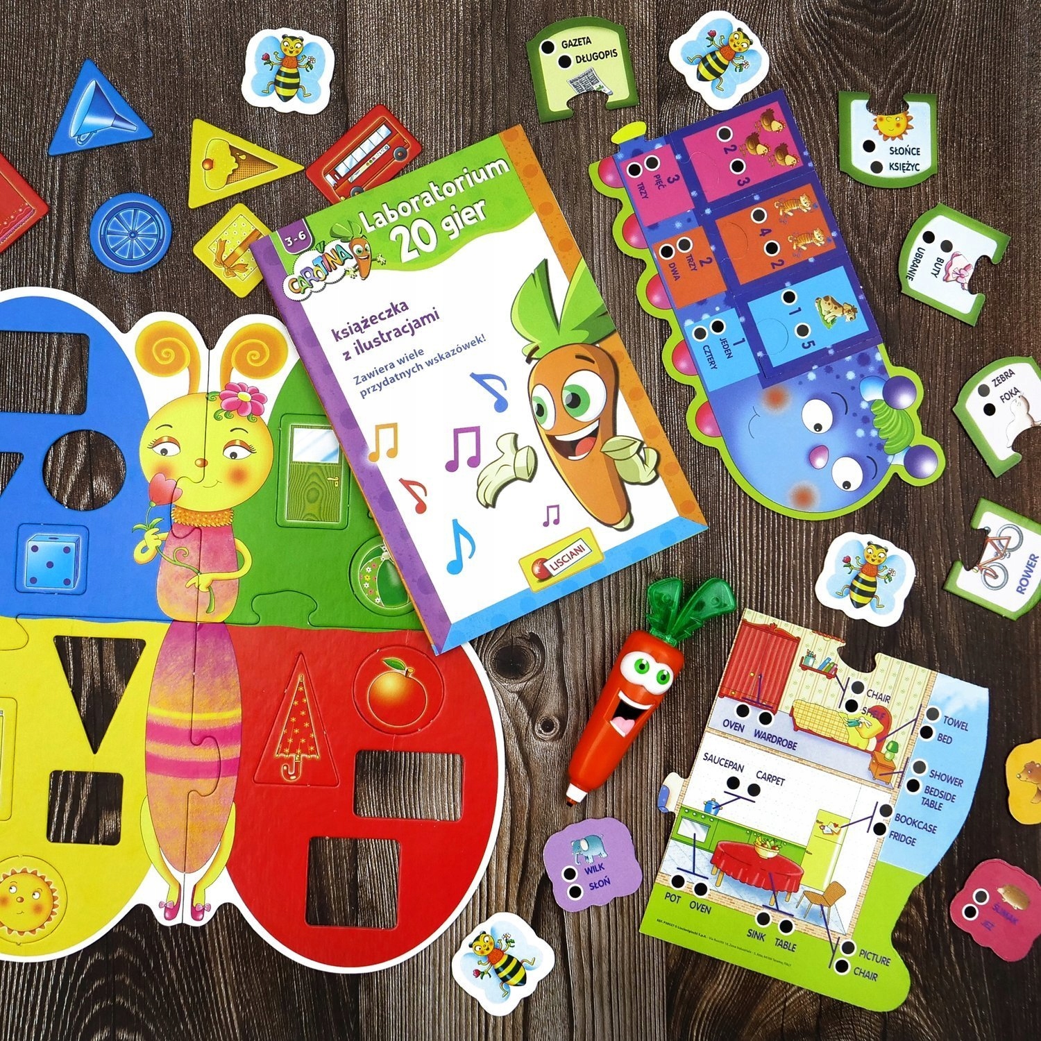 Фантастический набор с Каротиной содержит как целых двадцать развивающих игр: Гусеница с буквами, Многоножка с цифрами, улитка Мисс Вайолет, лотерея с животными, память с пчелками, множество других игр в виде больших досок. Кроме того, в каждой игре на внутренней странице есть электронная викторина с Каротиной, которая издает звуки восторга, если ответ правильный.