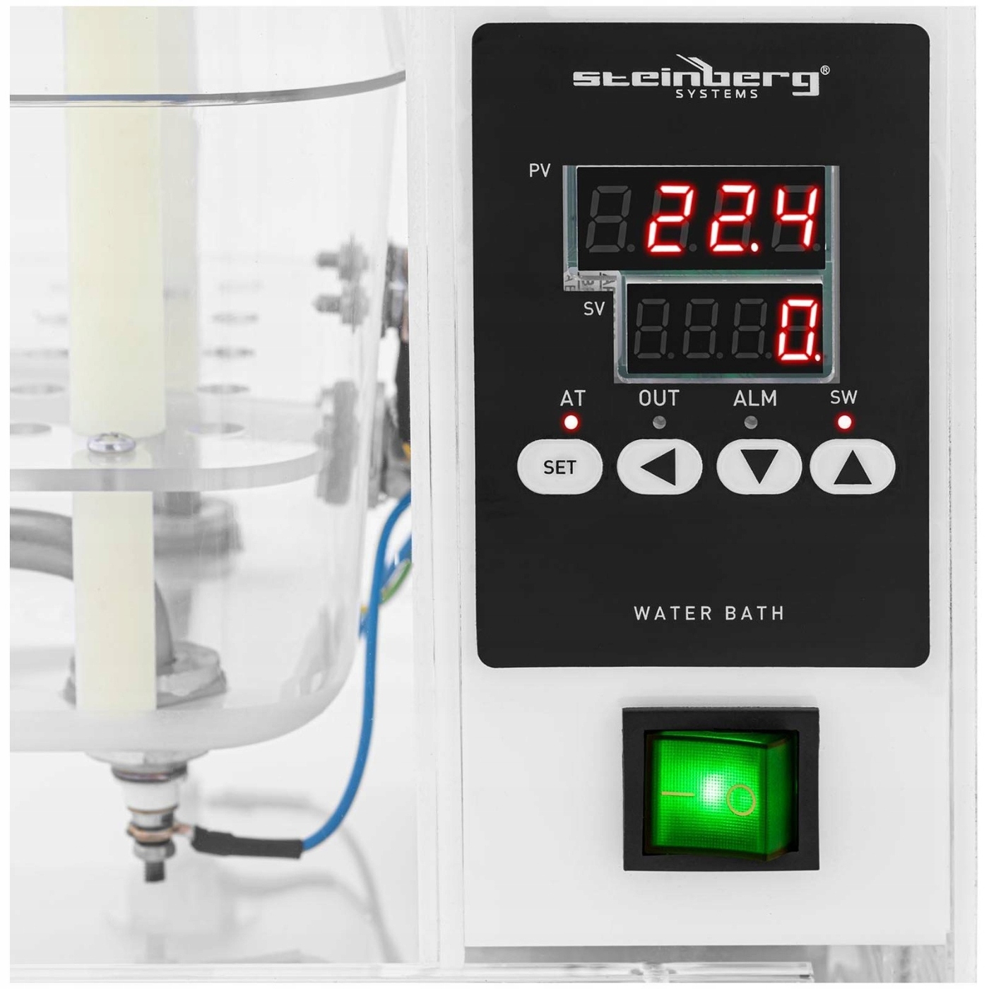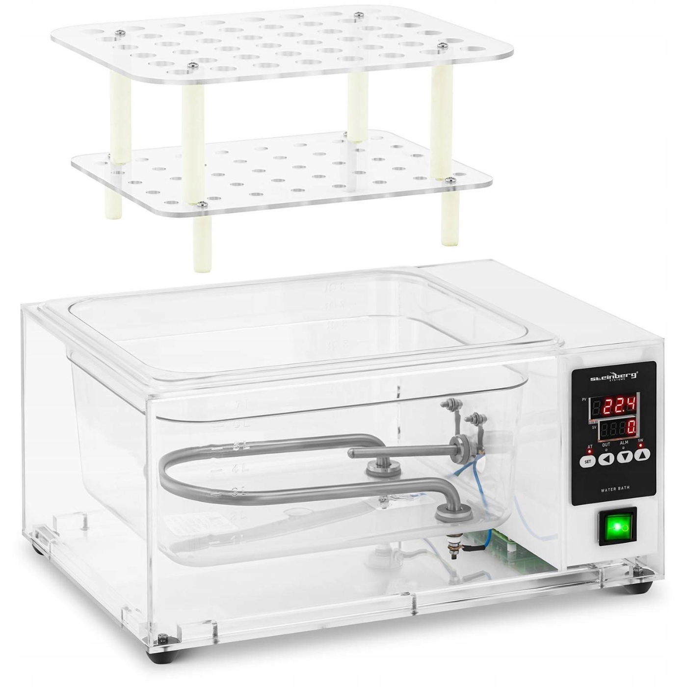 Лабораторная водяная баня имеет панель управления со светодиодным дисплеем, на котором наглядно отображаются заданные параметры. Интуитивное управление облегчает работу со всеми типами образцов. Кроме того, прозрачная конструкция устройства позволяет вам всегда следить за своими образцами. Контейнер из высококачественного пластика вмещает до 9 литров воды. Полка имеет размеры 290 х 230 х 140 мм. Если в баке недостаточно воды или существует риск перегрева, устройство подает сигнал тревоги. По завершении тестового режима также звучит акустический сигнал.