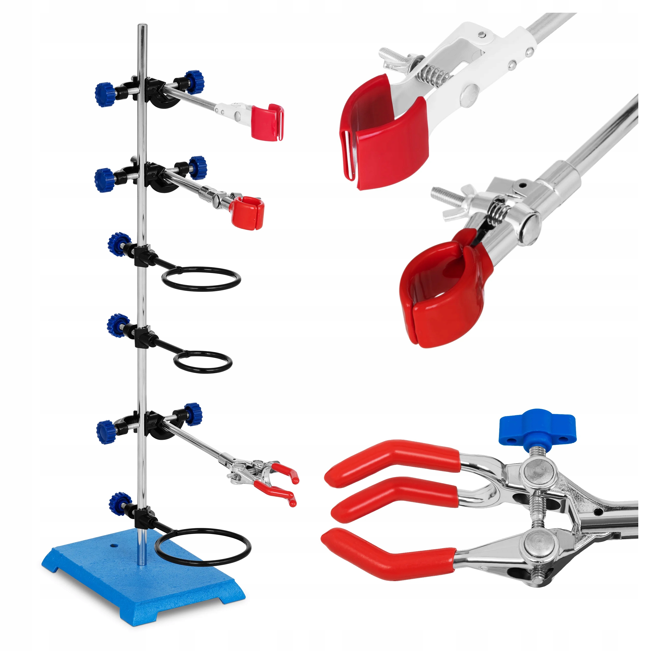 Посуда не выпадает из зажима-треножника благодаря трем ручкам с резиновыми накладками. Они предотвращают выскальзывание элементов с гладкими стеклянными стенками. Расстояние между губками можно подогнать под размеры лабораторного стекла в диапазоне 0-50 мм, 0-70 мм и 0-85 мм. Для проведения опытов с колбами или воронками будут использоваться специальные кольца (Ø60, Ø80 и Ø100 мм). Устойчивость модели SBS-LS-200 обеспечивает широкая и тяжелая база. В комплект также входят крестовины, подходящие для стержней диаметром 16 мм.