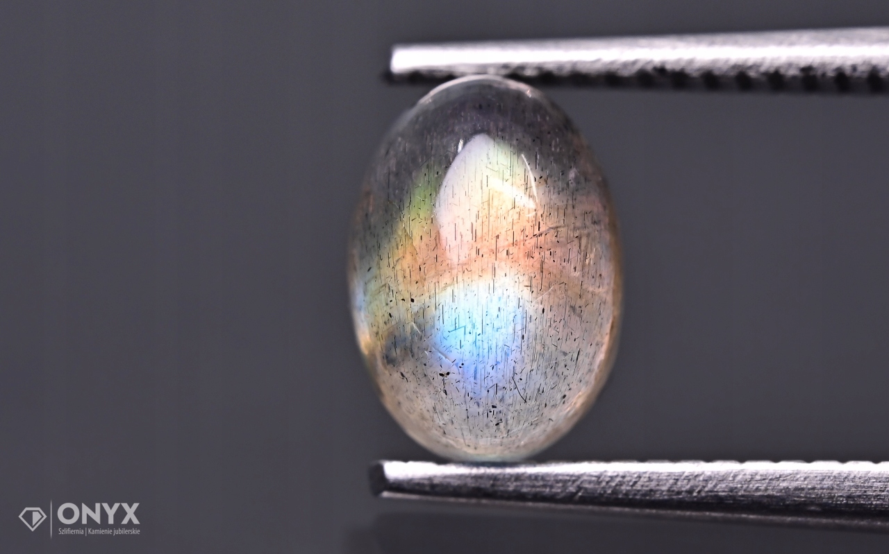 Образец лабрадорита, естественный камень в форме кабохона для производства авторских украшений.