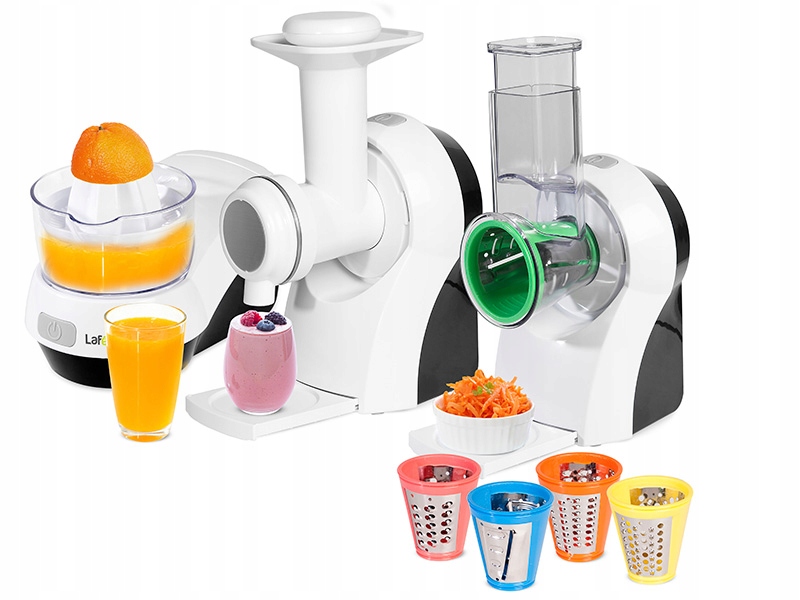 Очень практичное многофункциональное электрическое устройство с емкостью 150 Вт. Трио Lafe позволяет выжать сок и фрикционные фрукты. Вы можете быстро сделать восхитительный овощный салат или сжать вкусного свежего сока, не проведя много времени на кухне. Кроме того, специальная привязанность к смузи позволит вам приготовить вкусные и здоровые коктейли. Шреддер имеет современный вид и, безусловно, вполне вписывается в внутреннюю часть вашей кухни. Благодаря небольшим размерам устройство не занимает много места и может храниться на кухонном столе или в шкафу.