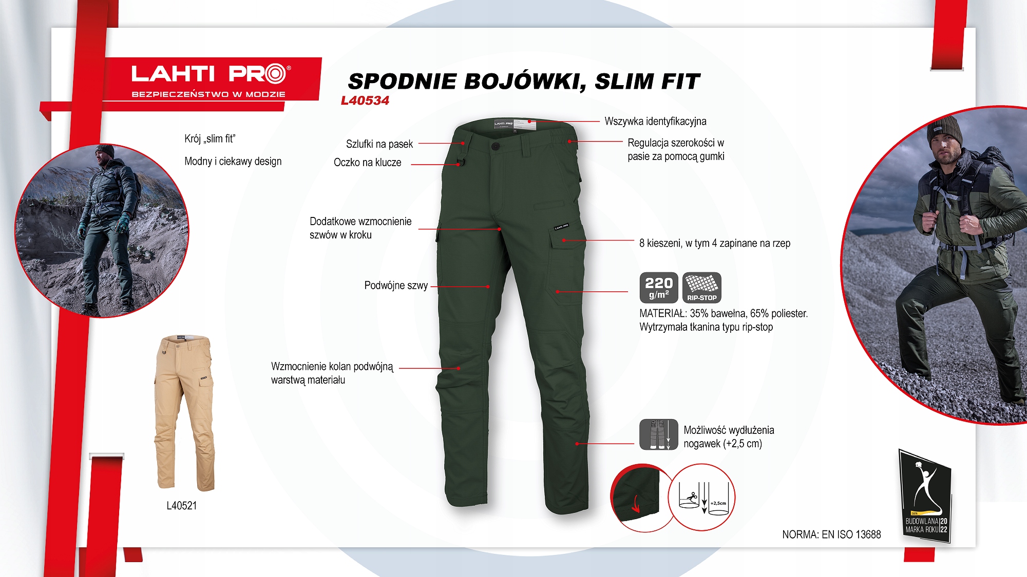 Брюки-карго Lahti Pro, модель L40534, представляют собой классические брюки-карго, созданные по образцу американских армейских штанов. Они идеальны для повседневного использования и идеальны для экстремальных условий. Удобный и очень прочный, и в то же время очень практичный. Материал брюк — ткань rip-spot, комбинация 65% полиэстера и 35% хлопка с высокой плотностью 255 г/м2, что дает очень прочное и в то же время дышащее переплетение. Брюки-карго Lahti Pro L40534 имеют восемь карманов, в том числе четыре на липучке. Двойные швы. Дополнительное усиление швов в промежности. Регулировка ширины талии с помощью резинки. Возможность удлинения ножек (+2,5 см). Замочная скважина. Петли для ремня. Усиление колена двойным слоем материала. Модный и интересный дизайн и приталенный крой. Идентификационная этикетка. Брюки Lahti Pro L40534 относятся к первой категории средств индивидуальной защиты, соответствуют стандарту EN ISO 13688 и имеют декларацию CE.