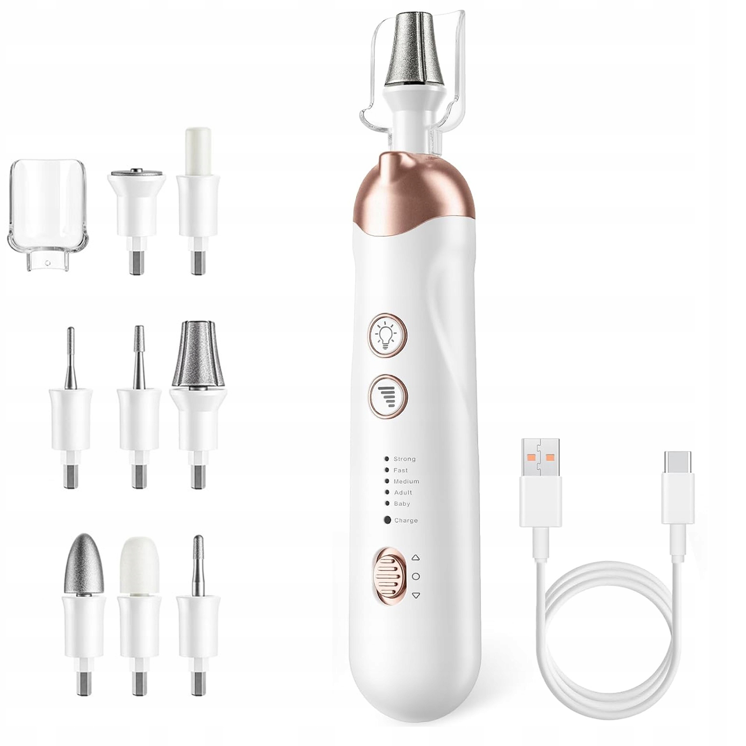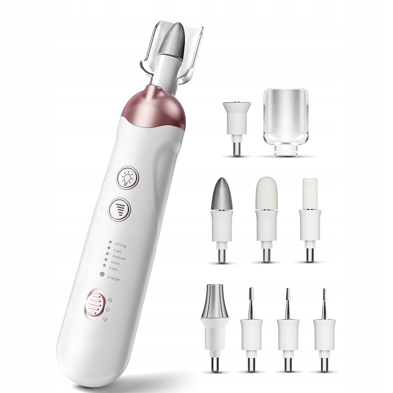 - Набор для ухода за ногками и ногтями, содержащий электрический файл ногтей, 8 Высококачественные тренировки для ногтей, 1 прозрачные защитные покрытия, кабель заряжая USB