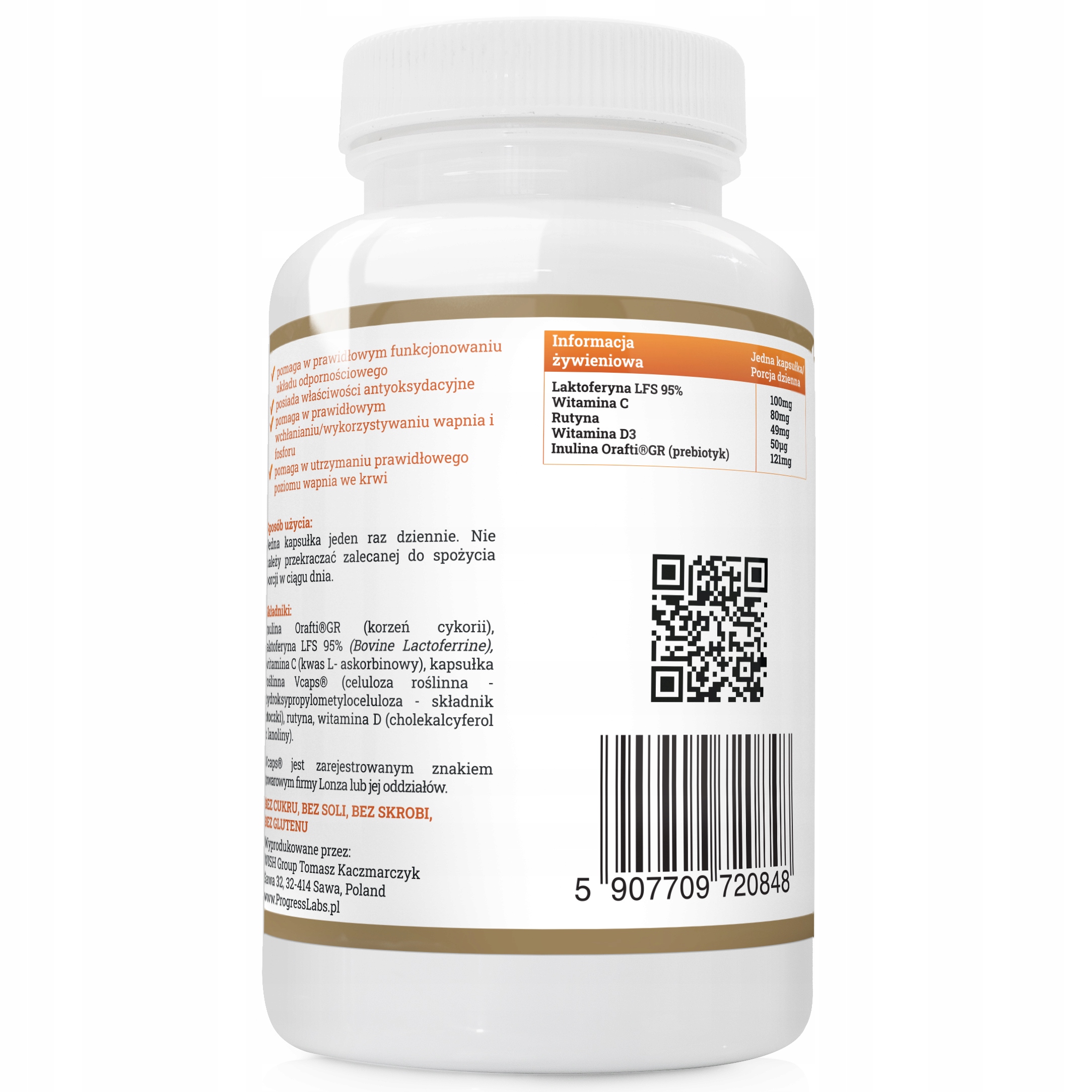 ИНГРЕДИЕНТЫ: Orafti®GR инулин (корень цикория), лактоферрин LFS 95% (бычий лактоферрин), витамин C L- аскорбиновая кислота), растительная капсула Vcaps® (гидроксипропилметилцеллюлоза - компонент оболочки), рутин, витамин D (холекальциферол из ланолина)
