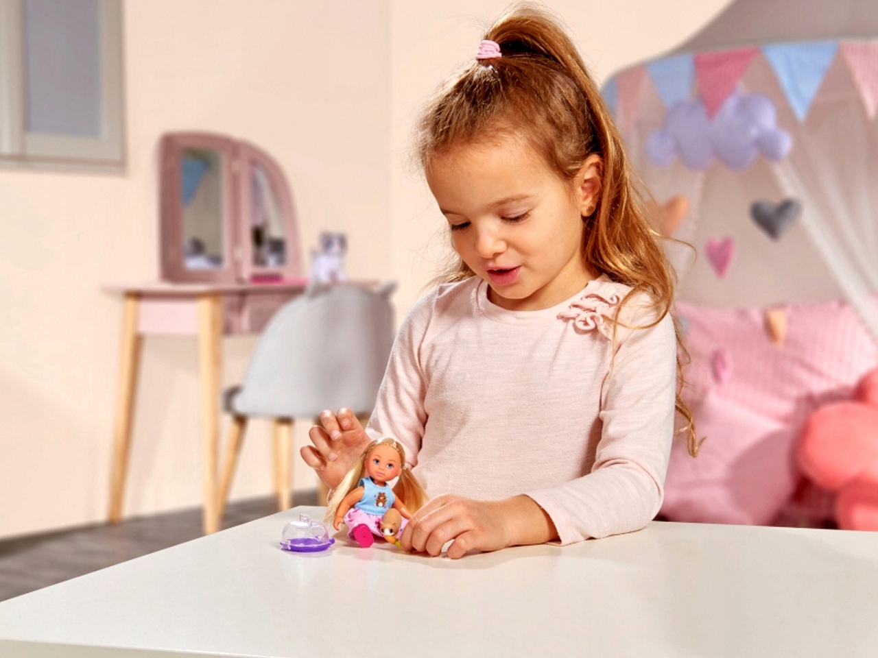 У куклы Эви длинные светлые волосы, она одета в синюю футболку, розовую юбку и розовые туфли. У него сгибаемые ножки в коленях и подвижные руки и запястья.