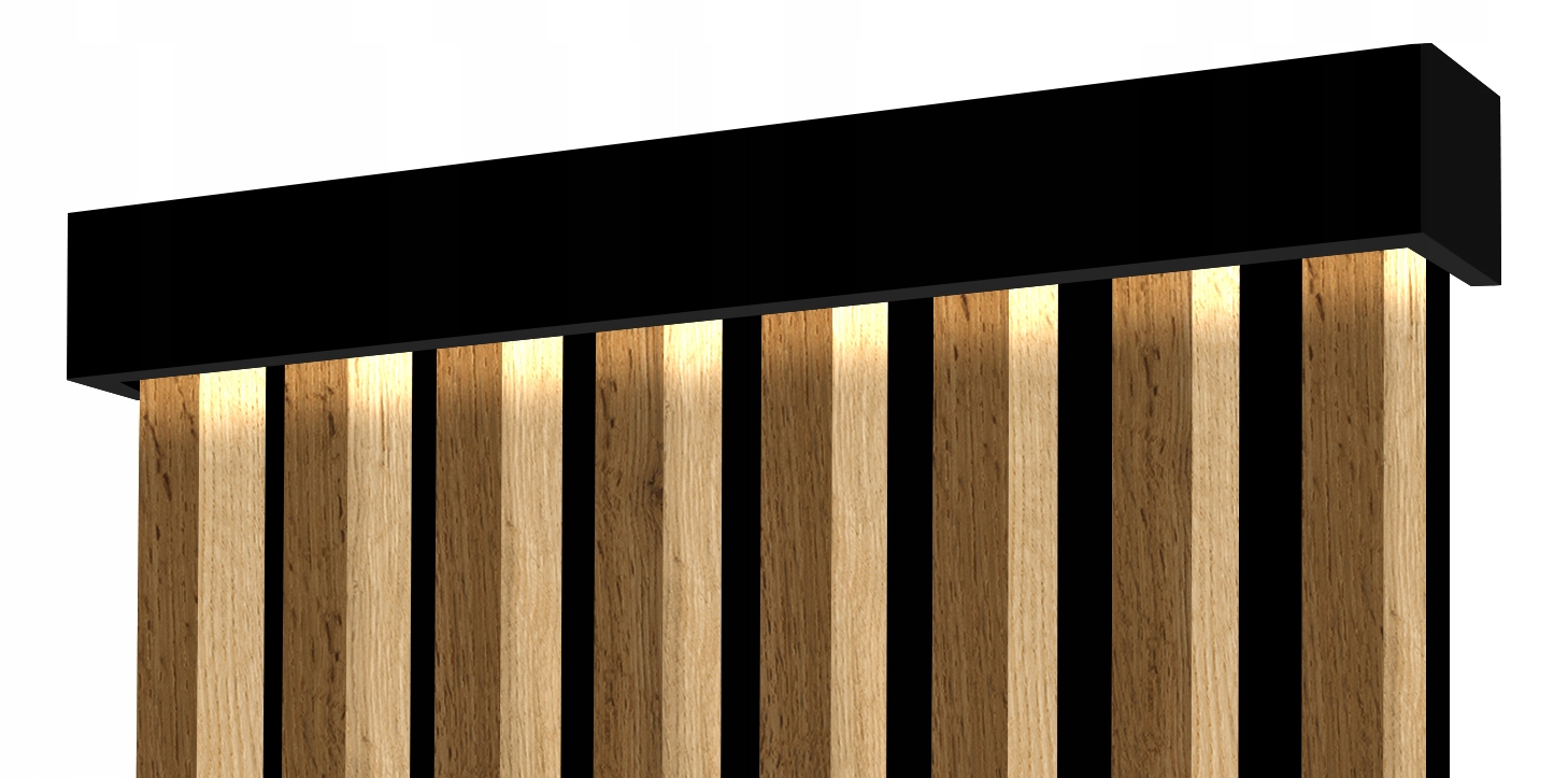 Декоративный элемент нашего бестселлера - планки на доске. Карниз с фрезеровкой под светодиодную ленту позволяет использовать освещение, подчеркивающее характер планок, размещенных на доске.
