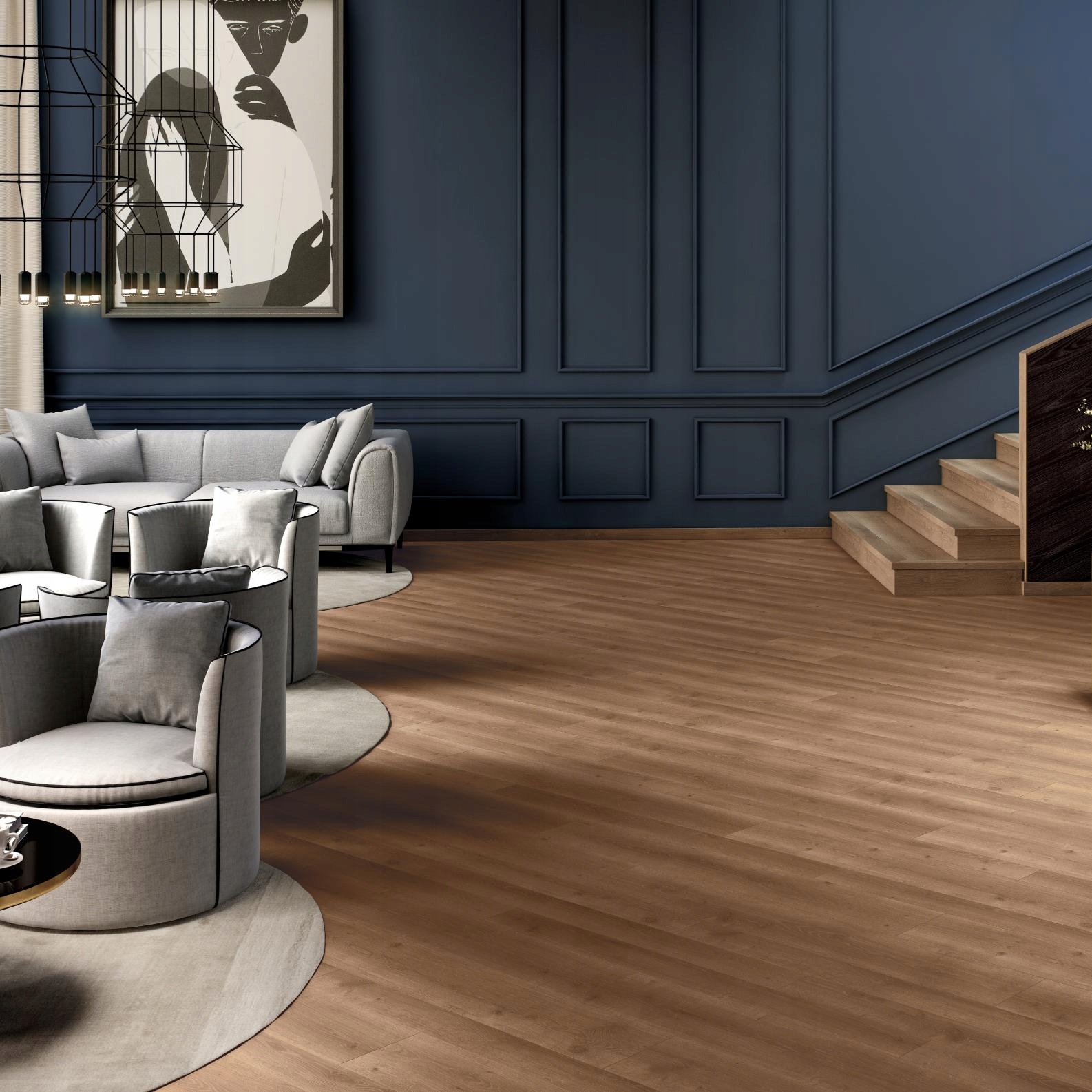 Структура «Wood Impression» в панелях Finfloor — это особый метод отделки поверхности, имитирующий внешний вид и текстуру настоящей древесины. Благодаря этой технологии панели имеют реалистичный рисунок древесины, в том числе текстуру и текстуру, что придает им естественный и аутентичный вид. Такая структура делает панели более эстетичными и напоминающими традиционные деревянные полы, обеспечивая при этом долговечность и простоту ухода, типичные для ламинированных напольных панелей.