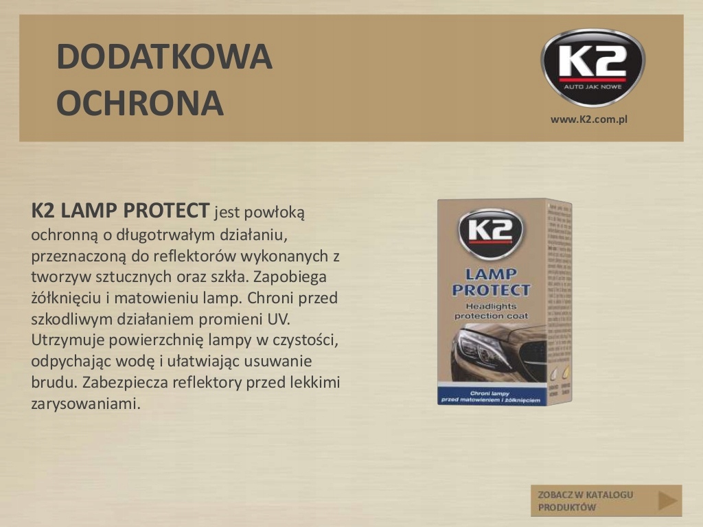 Прекрасное дополнение к пасте. K2 LAMP DOCTOR — защитное покрытие для фар K2 Lamp Protect, которое защищает лампы от матирования, пожелтения, царапин и УФ-лучей на срок до года с момента нанесения покрытия.