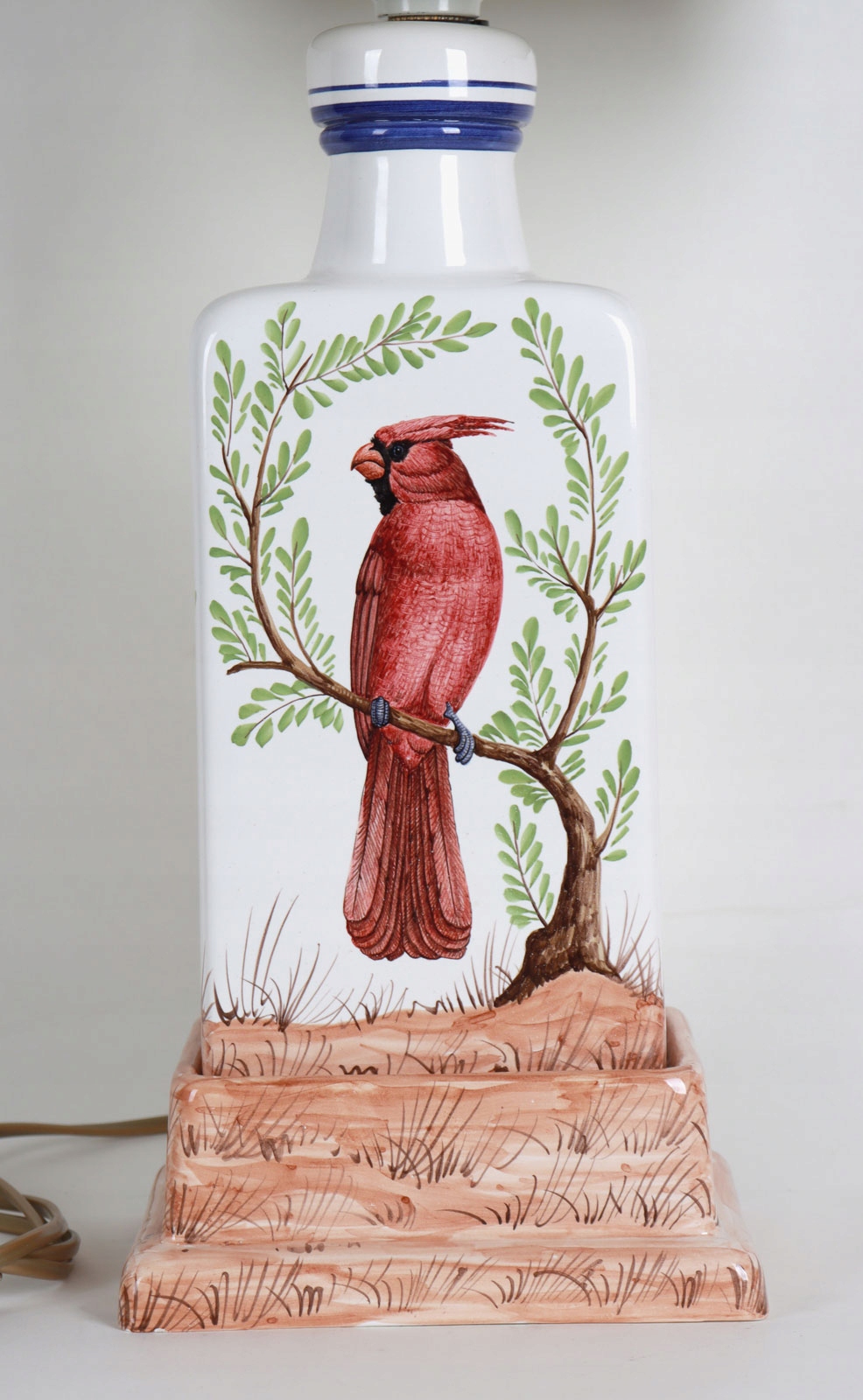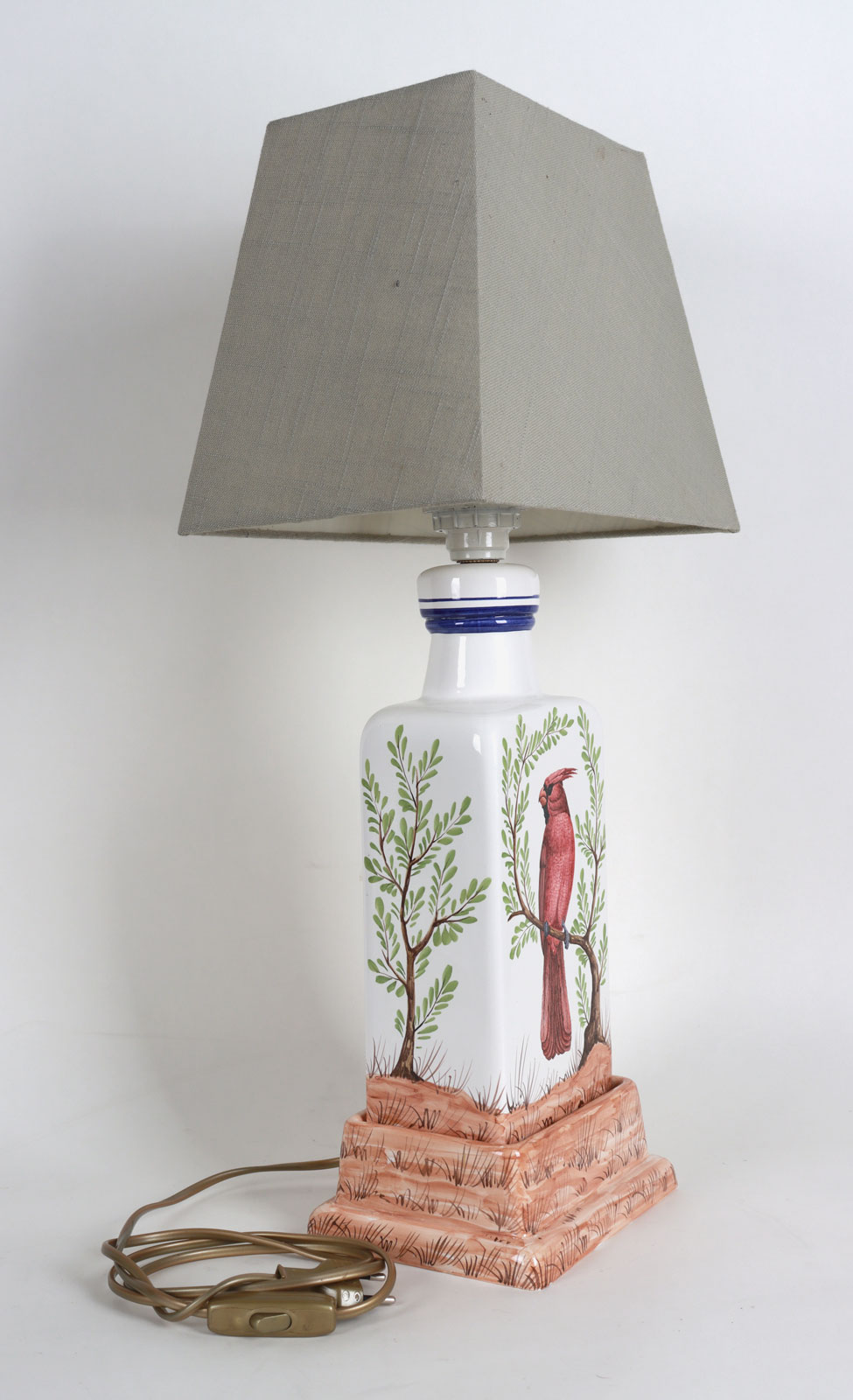 настольная лампа - основание и тело, сделанное из майолики. Маджолика украшена ручной живописью. Спереди, фигура хищной птицы. Материал абажура. Полная и эффективная лампа