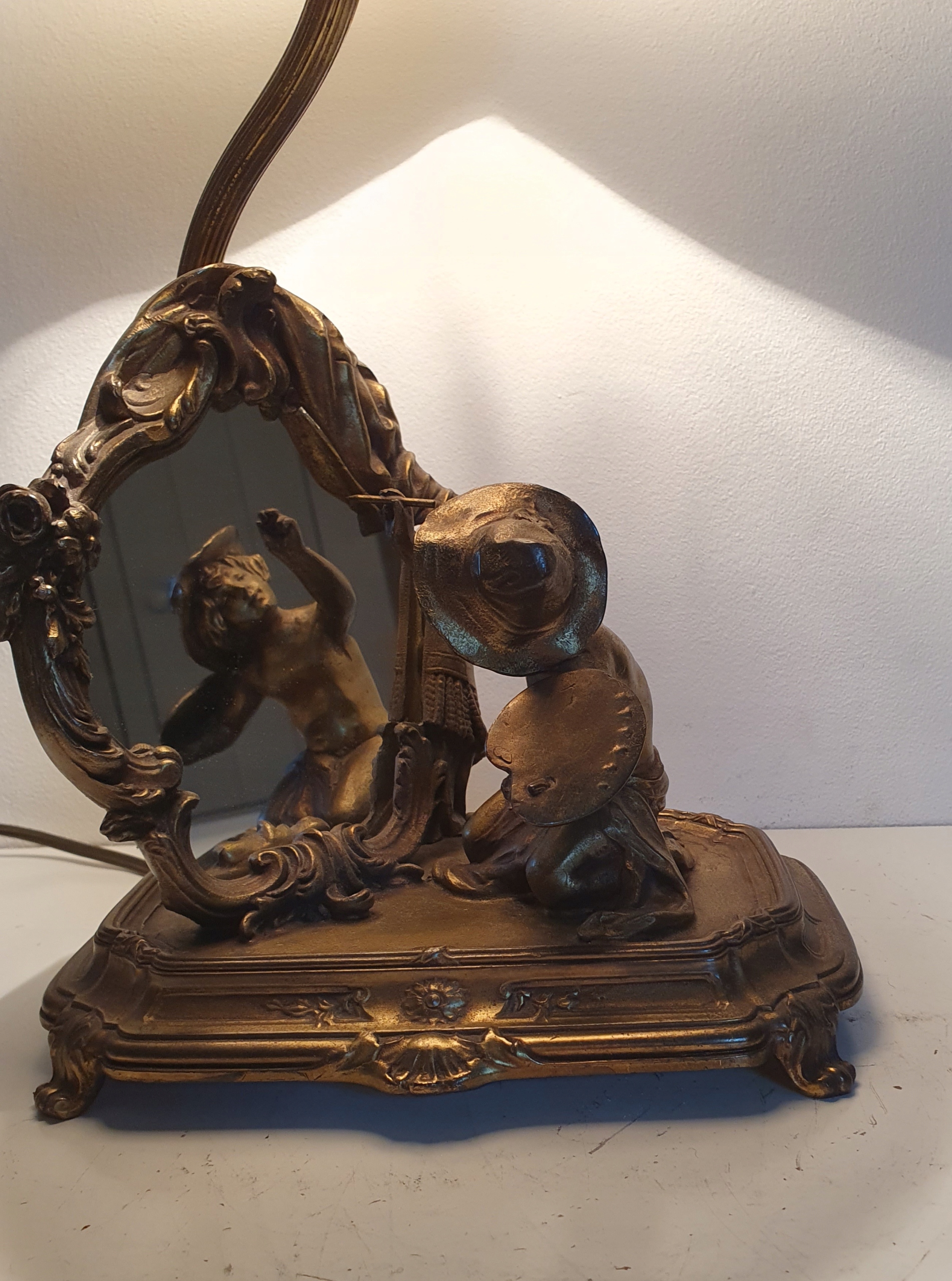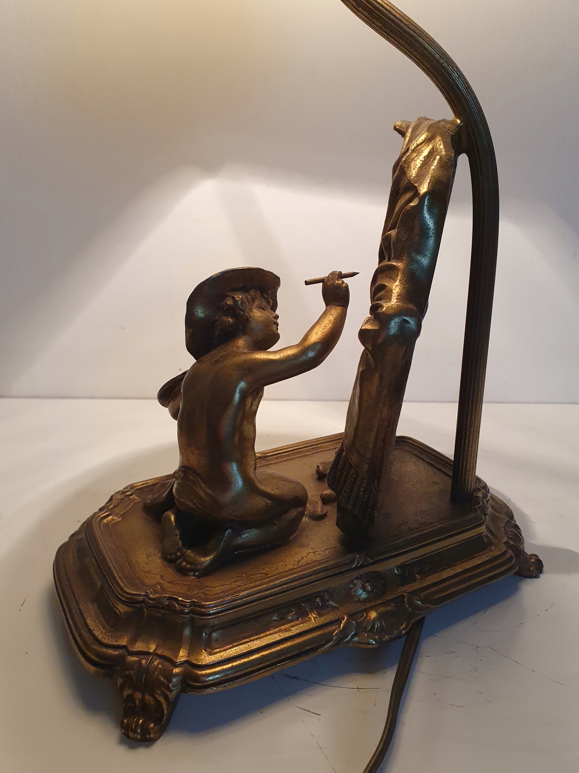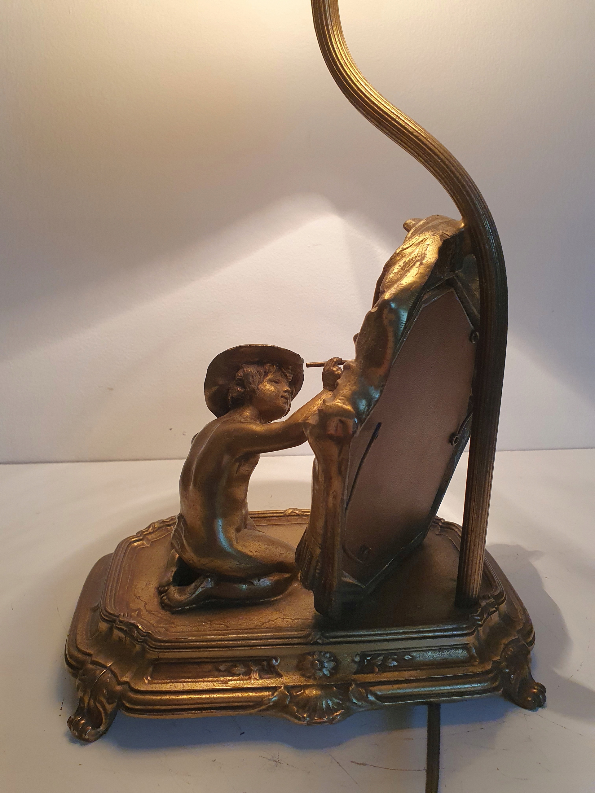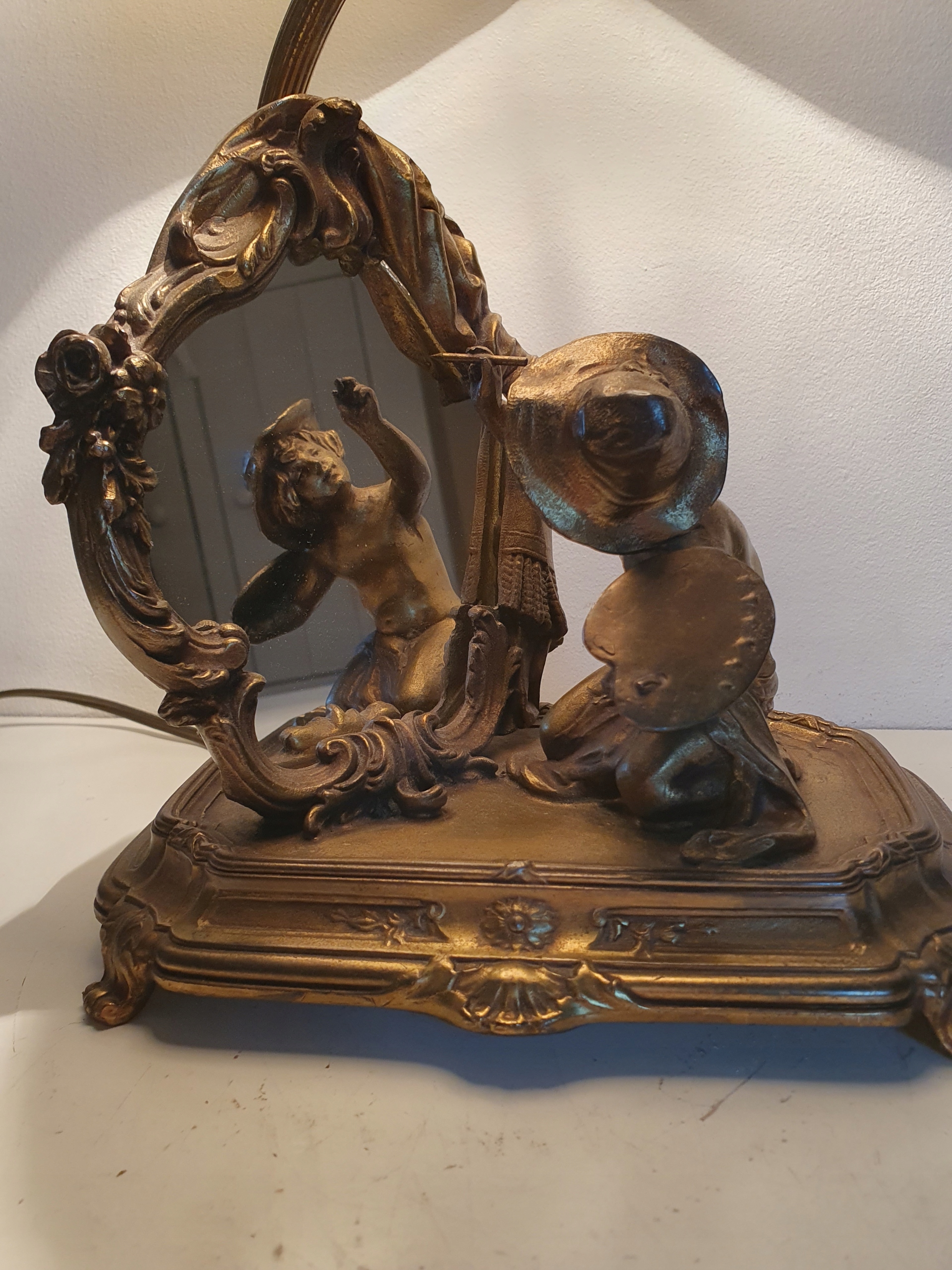 Элегантная настольная лампа примерно 1930 года, изготовленная из сочетания олова и латуни. В основании светильника изображена сцена рисования мальчика - в руке фигура держит цветовую палитру и кисть. Мальчик пишет картину, а место, которое должно было изображать его работу, заменено зеркалом, что придает всей композиции неповторимый шарм и глубину. Абажур выполнен из материала, напоминающего пергамент или тонкую кожу, украшен декоративной лентой. Все выполнено в классическом стиле с богатым декором. Высота светильника 42 см. Редкая коллекционная вещь, идеально подходящая для элегантного интерьера.